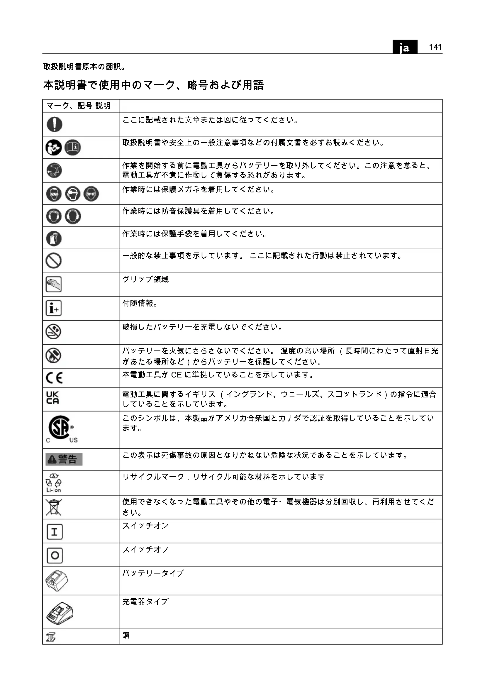 破損したバッテリーを充電しないでください。 バッテリーを火気にさらさないでください。 温度の高い場所 (長時間にわたって直射日光 があたる場所など)からバッテリーを保護してください。 本電動工具が CE に準拠していることを示しています。 電動工具に関するイギリス (イングランド、ウェールズ、スコットランド)の指令に適合 していることを示しています。 このシンボルは、本製品がアメリカ合衆国とカナダで認証を取得していることを示してい