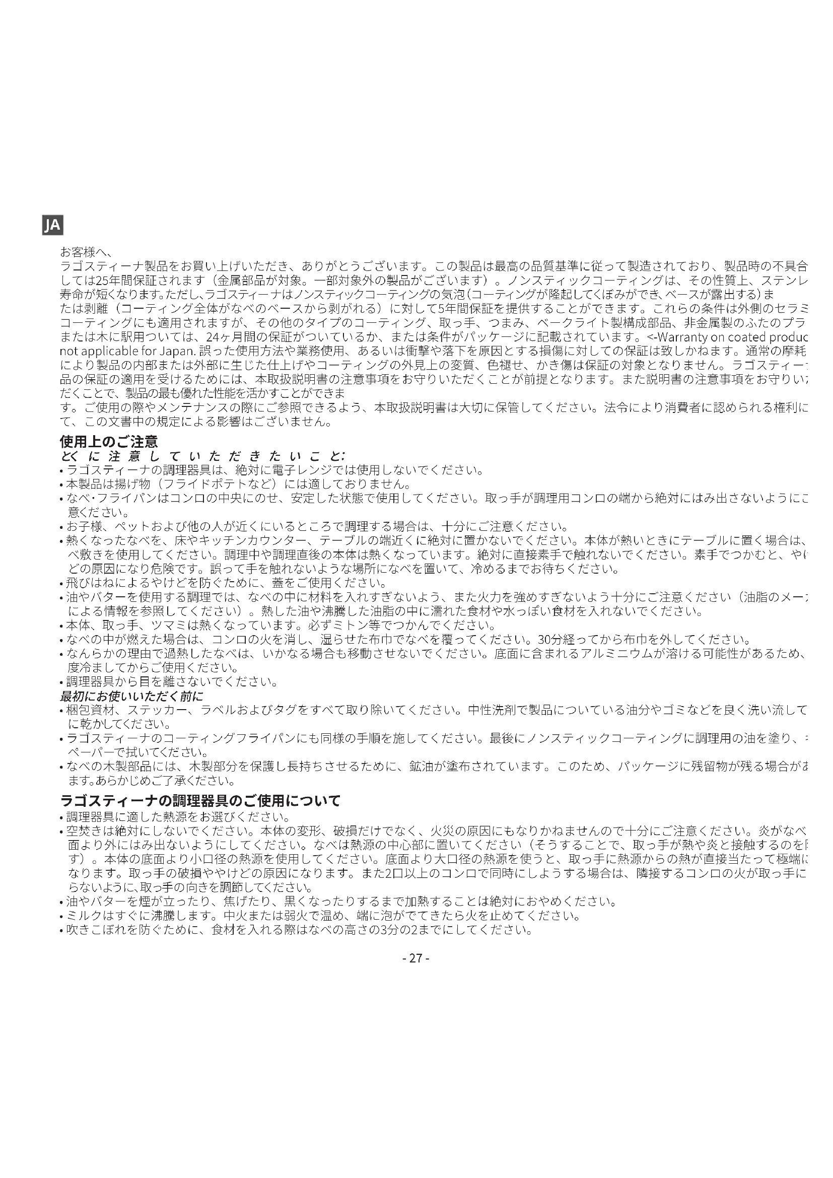ラゴスティーナ製品をお買い上げいただき、ありがとうございます。この製品は最高の品質基準に従って製造されており、製品時の不具合に対 しては25年間保証されます(金属部品が対象。一部対象外の製品がございます)。ノンスティックコーティングは、その性質上、ステンレスよりも 寿 命 が 短くなります。た だ し、ラゴスティー ナはノンスティックコ ー ティングの 気 泡(コ ーティングが 隆 起してくぼ み が でき、ベ ースが 露 出する)ま たは剥離(コーティング全体がなべのベースから剥がれる)に対して5年間保証を提供することができます。これらの条件は外側のセラミック コーティングにも適用されますが、その他のタイプのコーティング、取っ手、つまみ、ベークライト製構成部品、非金属製のふたのプラスチック または木に駅用ついては、24ヶ月間の保証がついているか、または条件がパッケージに記載されています。<-Warranty on coated products not applicable for Japan. 誤った使用方法や業務使用、あるいは衝撃や落下を原因とする損傷に対しての保証は致しかねます。通常の摩耗 により製品の内部または外部に生じた仕上げやコーティングの外見上の変質、色褪せ、かき傷は保証の対象となりません。ラゴスティーナ製 品の保証の適用を受けるためには、本取扱説明書の注意事項をお守りいただくことが前提となります。また説明書の注意事項をお守りいた だくことで、製品の最も優れた性能を活かすことができま す。ご使用の際やメンテナンスの際にご参照できるよう、本取扱説明書は大切に保管してください。法令により消費者に認められる権利に対し て、この文書中の規定による影響はございません。