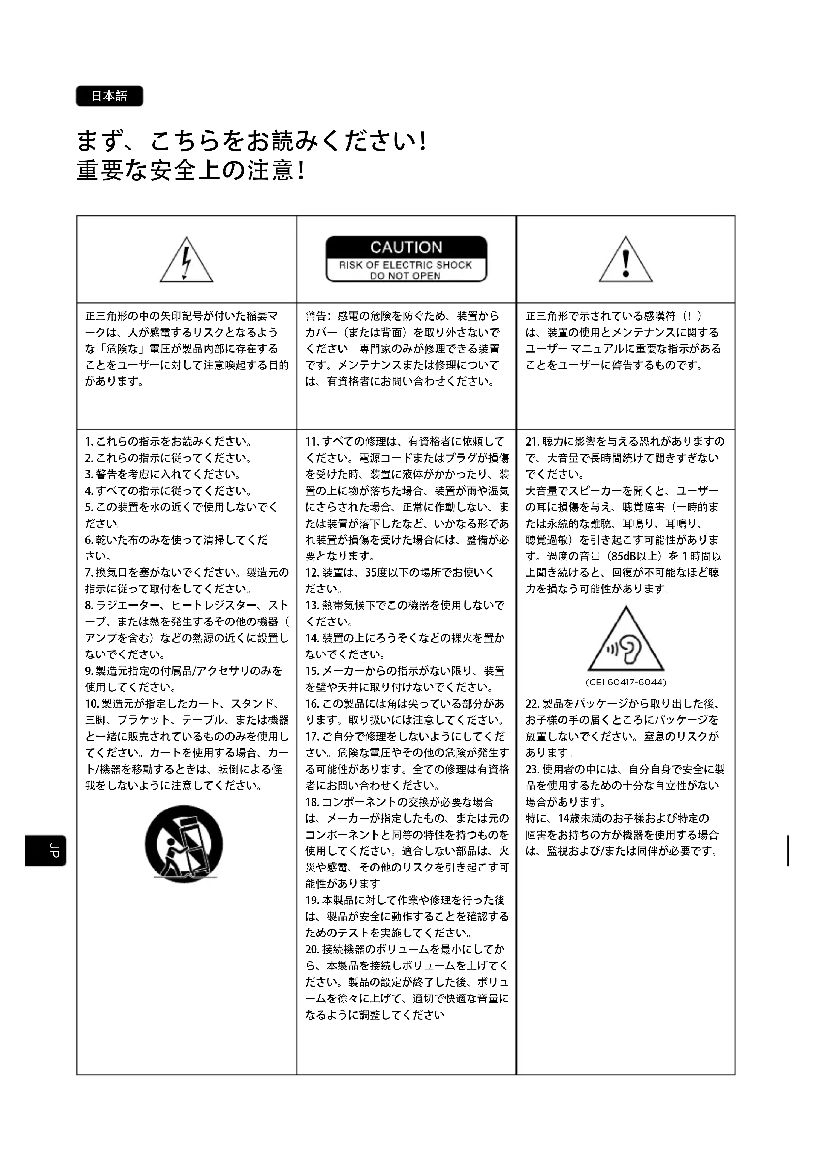 警告:感電の危険を防ぐため、装置から カバー(または背面)を取り外さないで ください。専門家のみが修理できる装置 です。メンテナンスまたは修理について は、有資格者にお問い合わせください。 正三角形で示されている感嘆符(!) は、装置の使用とメンテナンスに関する ユーザー マニュアルに重要な指示がある ことをユーザーに警告するものです。