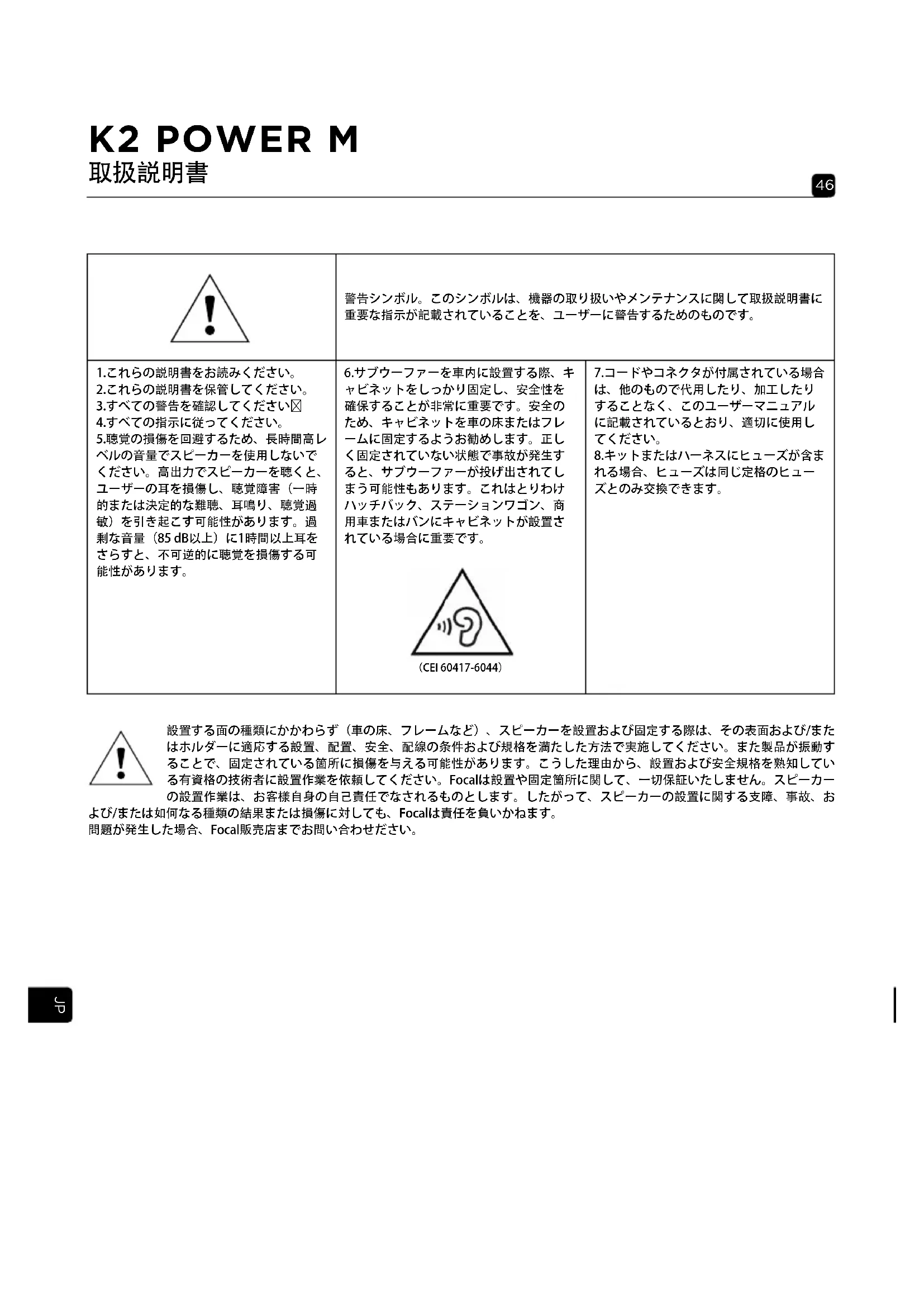 8.キットまたはハーネスにヒューズが含ま れる場合、ヒューズは同じ定格のヒュー ズとのみ交換できます。 (CEI 60417-6044) 設置する面の種類にかかわらず(車の床、フレームなど)、スピーカーを設置および固定する際は、その表面および/また はホルダーに適応する設置、配置、安全、配線の条件および規格を満たした方法で実施してください。また製品が振動す ることで、固定されている箇所に損傷を与える可能性があります。こうした理由から、設置および安全規格を熟知してい る有資格の技術者に設置作業を依頼してください。Focalは設置や固定箇所に関して、一切保証いたしません。スピーカー の設置作業は、お客様自身の自己責任でなされるものとします。したがって、スピーカーの設置に関する支障、事故、お よび/または如何なる種類の結果または損傷に対しても、Focalは責任を負いかねます。 問題が発生した場合、Focal販売店までお問い合わせださい。