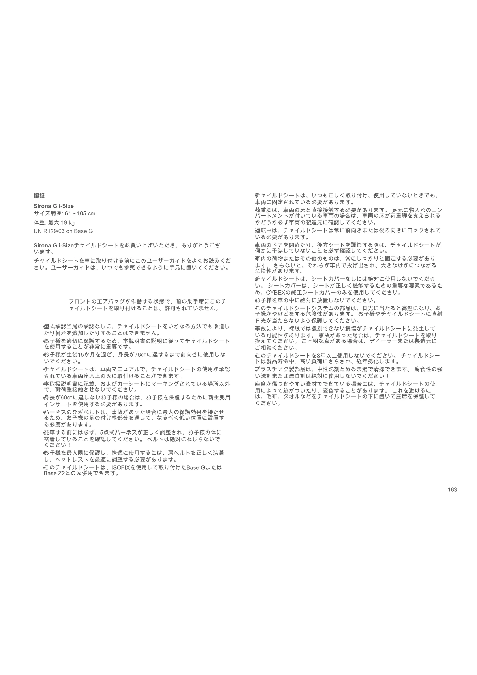 Sirona G i-Size サイズ範囲: 61~105 cm 体重: 最大 19 kg UN R129/03 on Base G Sirona G i-Sizeチャイルドシートをお買い上げいただき、ありがとうござ