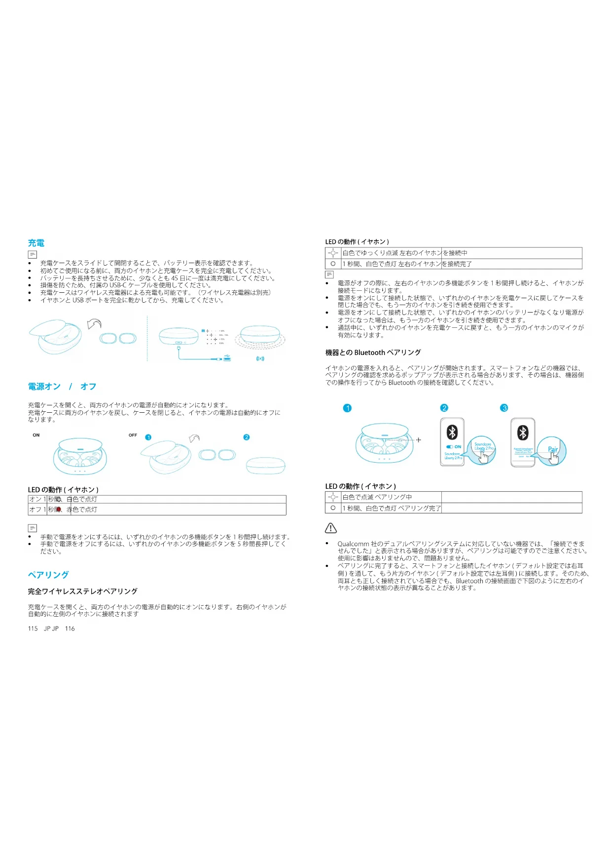 ペアリングに完了すると、スマートフォンと接続したイヤホン ( デフォルト設定では右耳 側 ) を通して、もう片方のイヤホン ( デフォルト設定では左耳側 ) に接続します。そのため、 両耳とも正しく接続されている場合でも、Bluetooth の接続画面で下図のように左右のイ ヤホンの接続状態の表示が異なることがあります。117 JP JP 118 別の Bluetooth 機器とペアリングするには、イヤホンを充電ケースに戻して、充電中の状態に します。ケースのカバーを開いたまま、充電ケースのボタンを 3 秒間押し続けます。右イヤ ホンの LED 表示が、高速で点滅します。