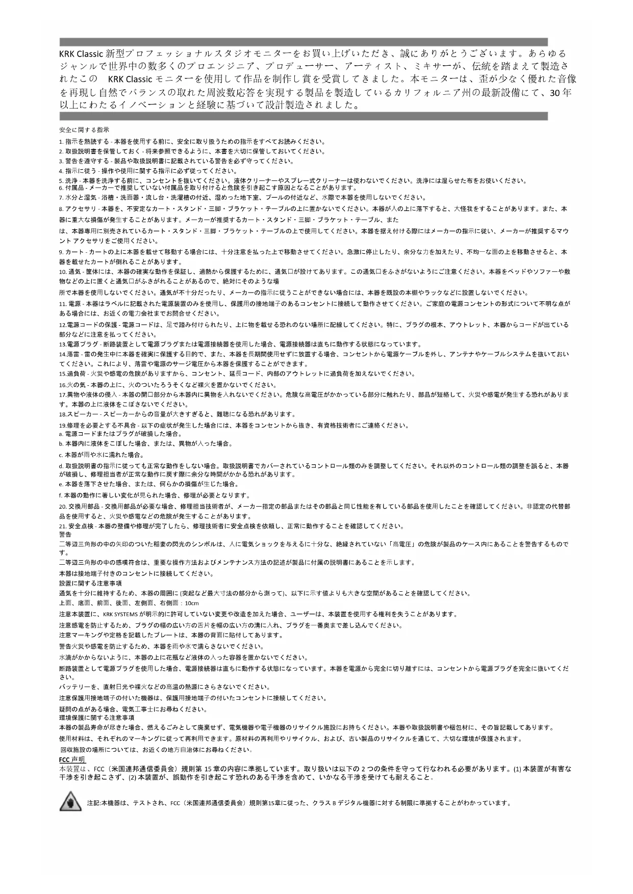 通気を⼗分に維持するため、本器の周囲に (突起など最⼤⼨法の部分から測って)、以下に⽰す値よりも⼤きな空間があることを確認してください。 上⾯、底⾯、前⾯、後⾯、左側⾯、右側⾯:10cm 注意本装置に、KRK SYSTEMS が明⽰的に許可していない変更や改造を加えた場合、ユーザーは、本装置を使⽤する権利を失うことがあります。 注意感電を防⽌するため、プラグの幅の広い⽅の⾆⽚を幅の広い⽅の溝に⼊れ、プラグを⼀番奥まで差し込んでください。 注意マーキングや定格を記載したプレートは、本器の背⾯に貼付してあります。 警告⽕災や感電を防⽌するため、本器を⾬や⽔で濡らさないでください。 ⽔滴がかからないように、本器の上に花瓶など液体の⼊った容器を置かないでください。 断路装置として電源プラグを使⽤した場合、電源接続器は直ちに動作する状態になっています。本器を電源から完全に切り離すには、コンセントから電源プラグを完全に抜いてくだ