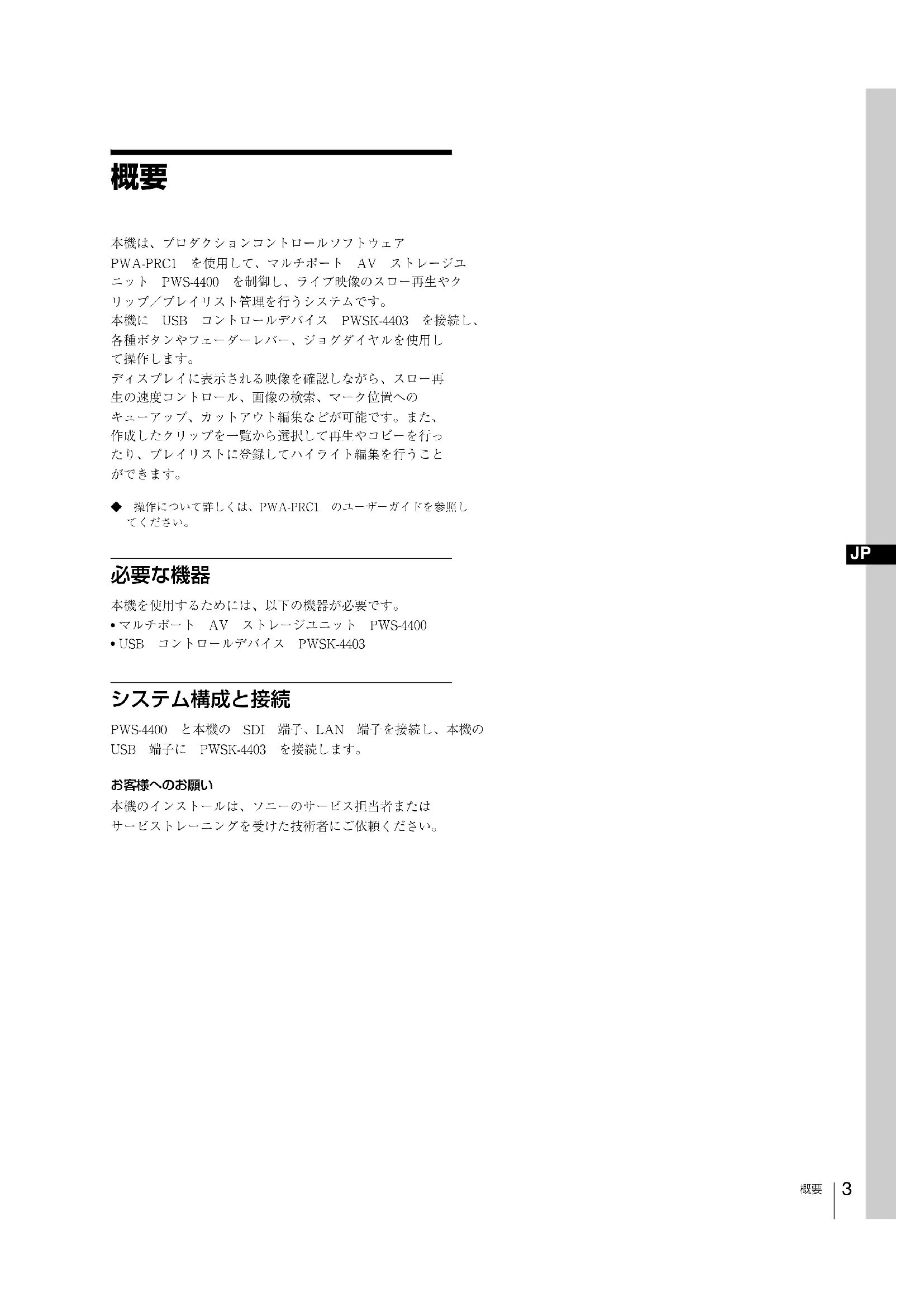 本機は、プロダクションコントロールソフトウェア PWA-PRC1 を使用して、マルチポート AV ストレージユ ニット PWS-4400 を制御し、ライブ映像のスロー再生やク リップ/プレイリスト管理を行うシステムです。 本機に USB コントロールデバイス PWSK-4403 を接続し、 各種ボタンやフェーダーレバー、ジョグダイヤルを使用し