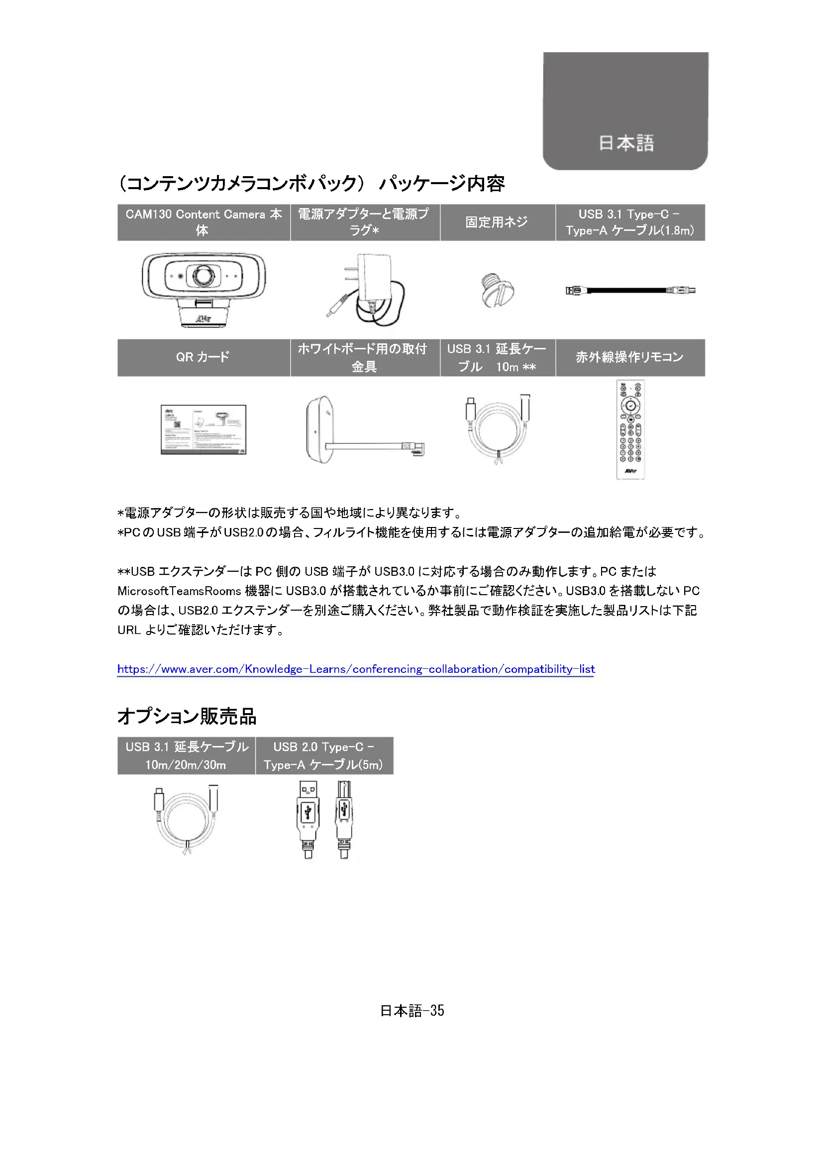 https://www.aver.com 新北市土城区大安路 157 号 8 楼 电话:(02)2269-8535日本語-35 (コンテンツカメラコンボパック) パッケージ内容 CAM130 Content Camera 本
