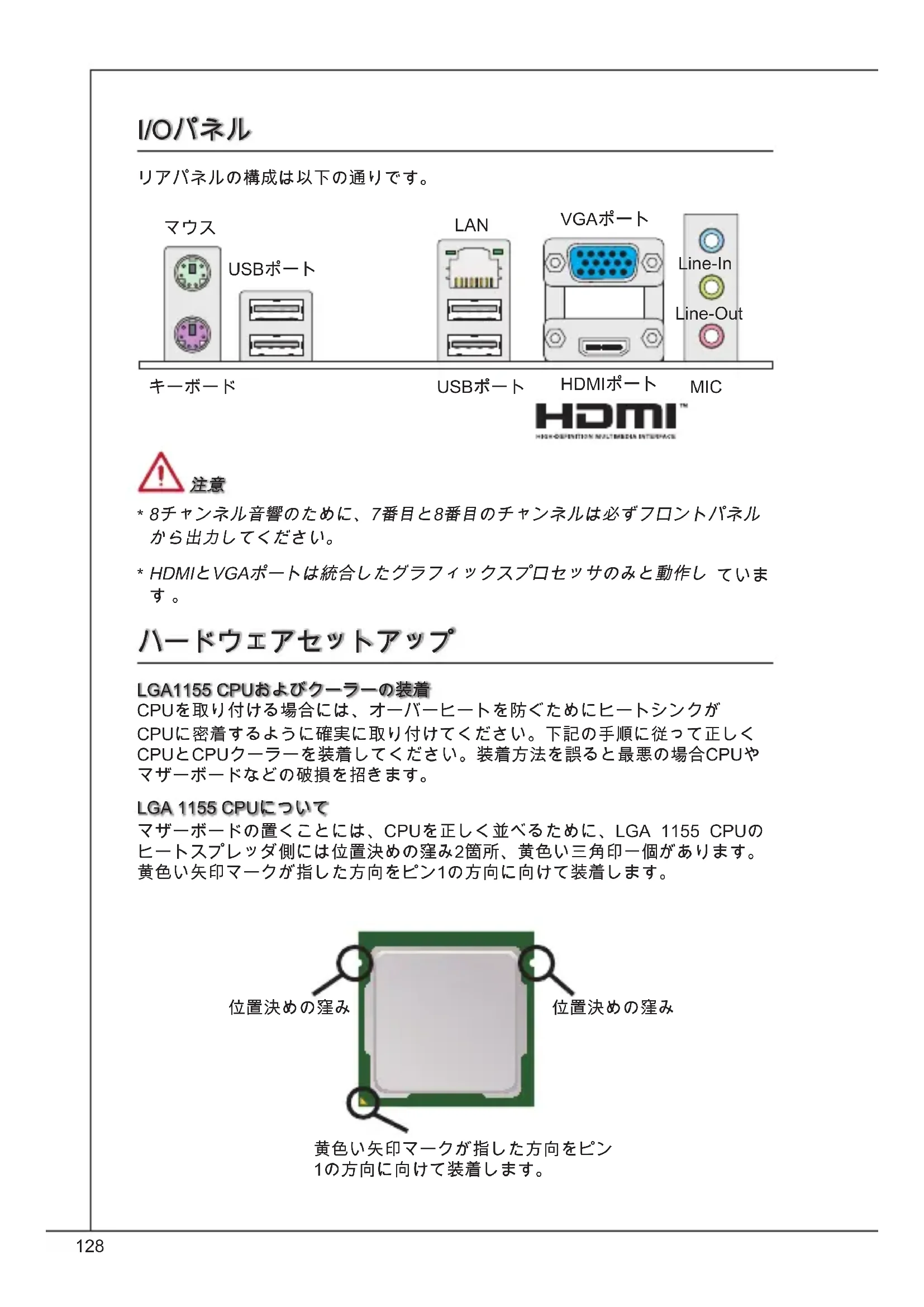 8チャンネル音響のために、7番目と8番目のチャンネルは必ずフロントパネル から出力してください。 HdMIとVGAポートは統合したグラフィックスプロセッサのみと動作し