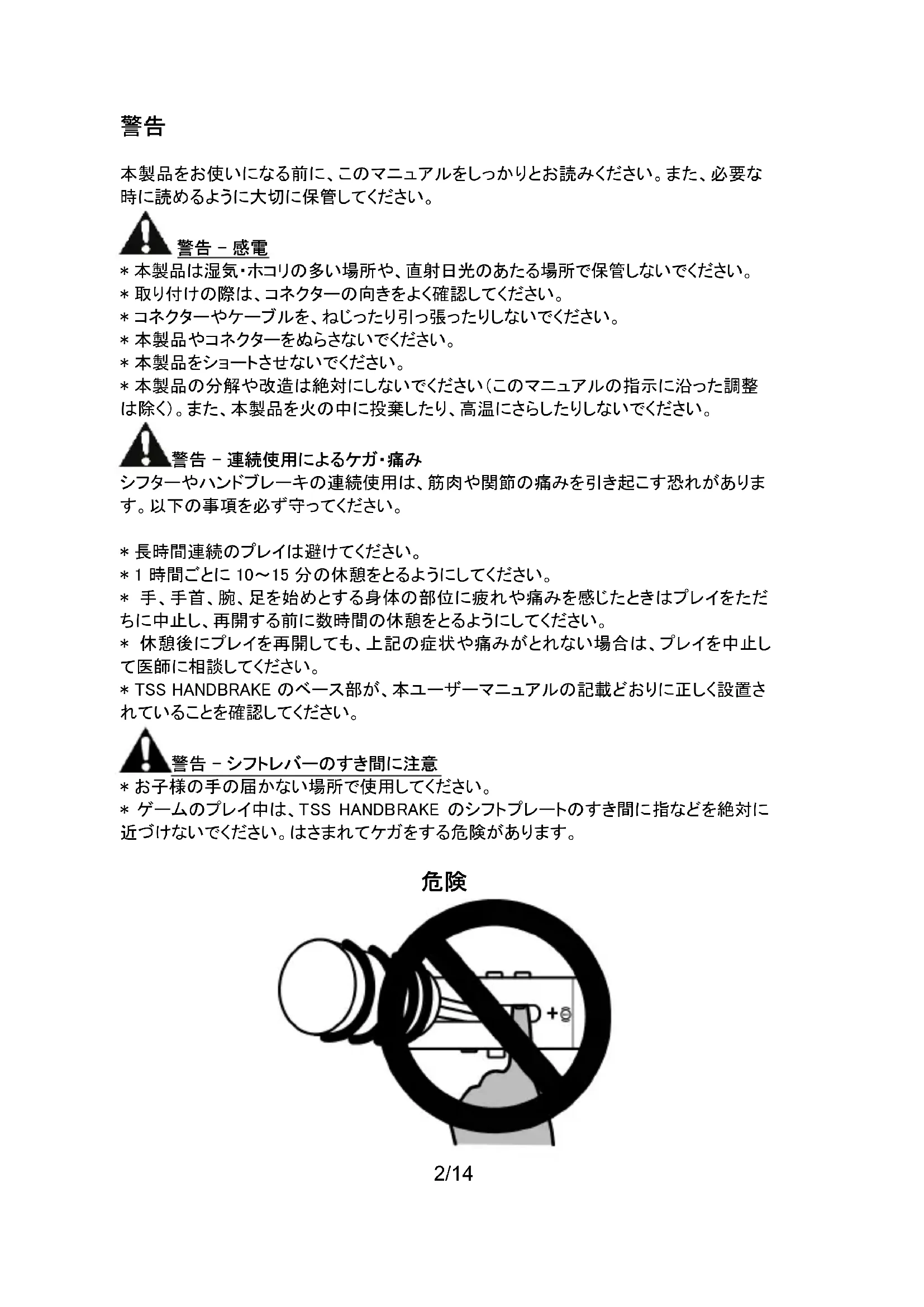 - ゲームのプレイ中は、TSS HANDBRAKE のシフトプレートのすき間に指などを絶対に 近づけないでください。はさまれてケガをする危険があります。 危険3/14