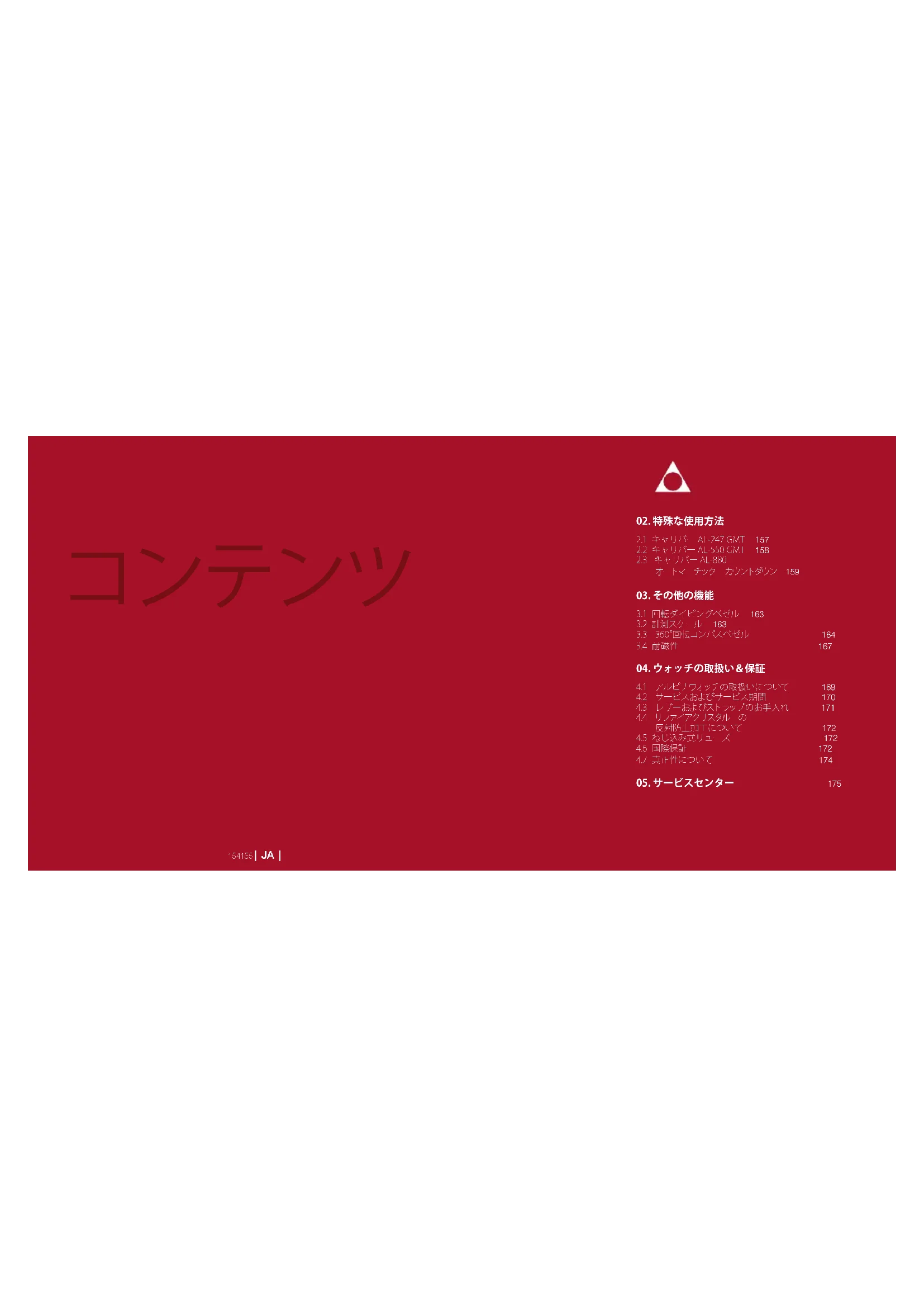 158 | JA |機能:時、分、秒、日付、GMT(第二時間帯) GMT機能の使用方法: GMT機能には、メインの時針と瞬時に見分け がつくよう、赤い矢印の別の時針が備えられています。この時針は、 24時間表示のダイヤルを1周し、 参照時刻を示します。現地時刻を示す針は、 1時間単位で簡単に調整することができます。 旅先では、リューズをポジション