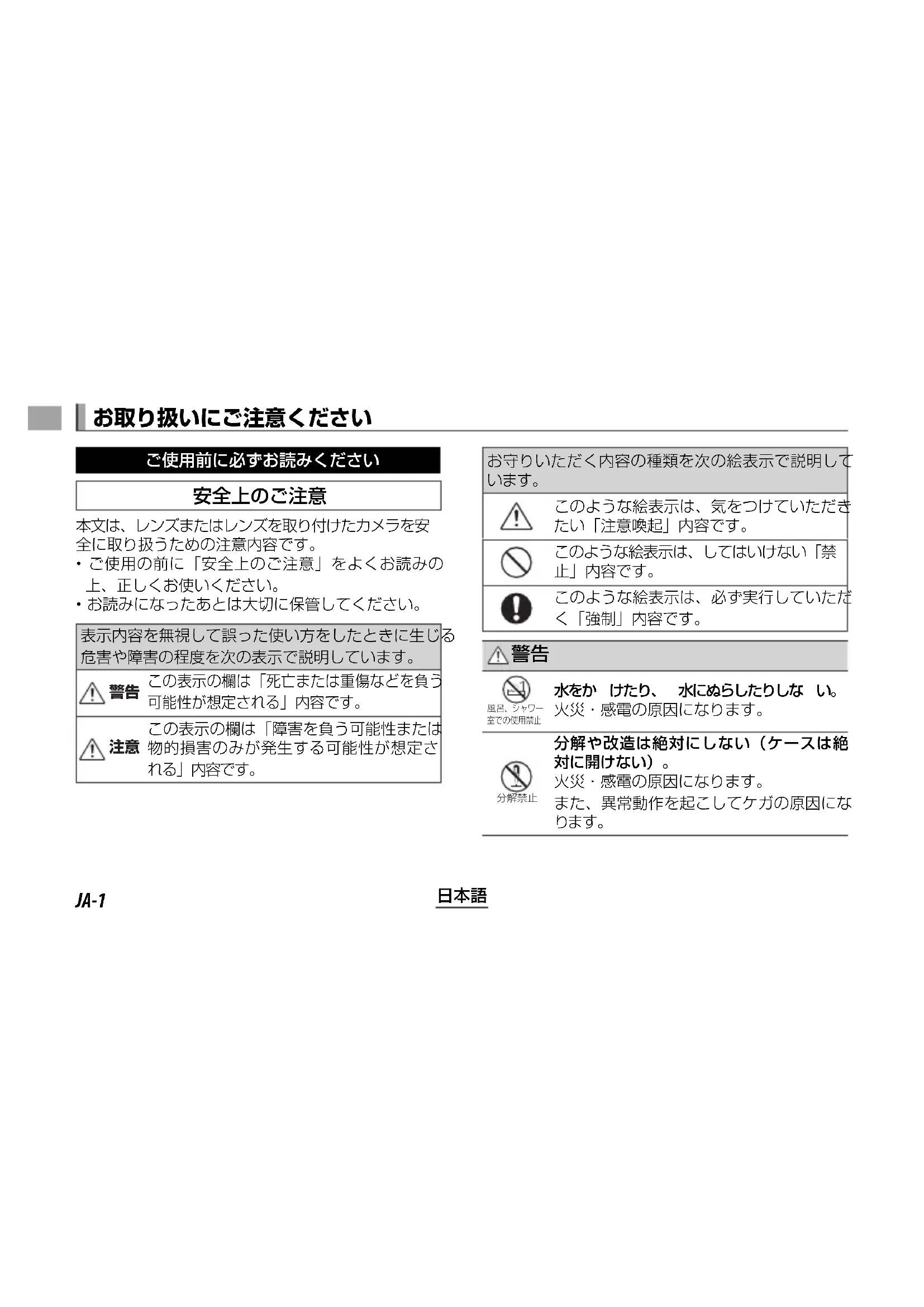 本文は、レンズまたはレンズを取り付けたカメラを安 全に取り扱うための注意内容です。
