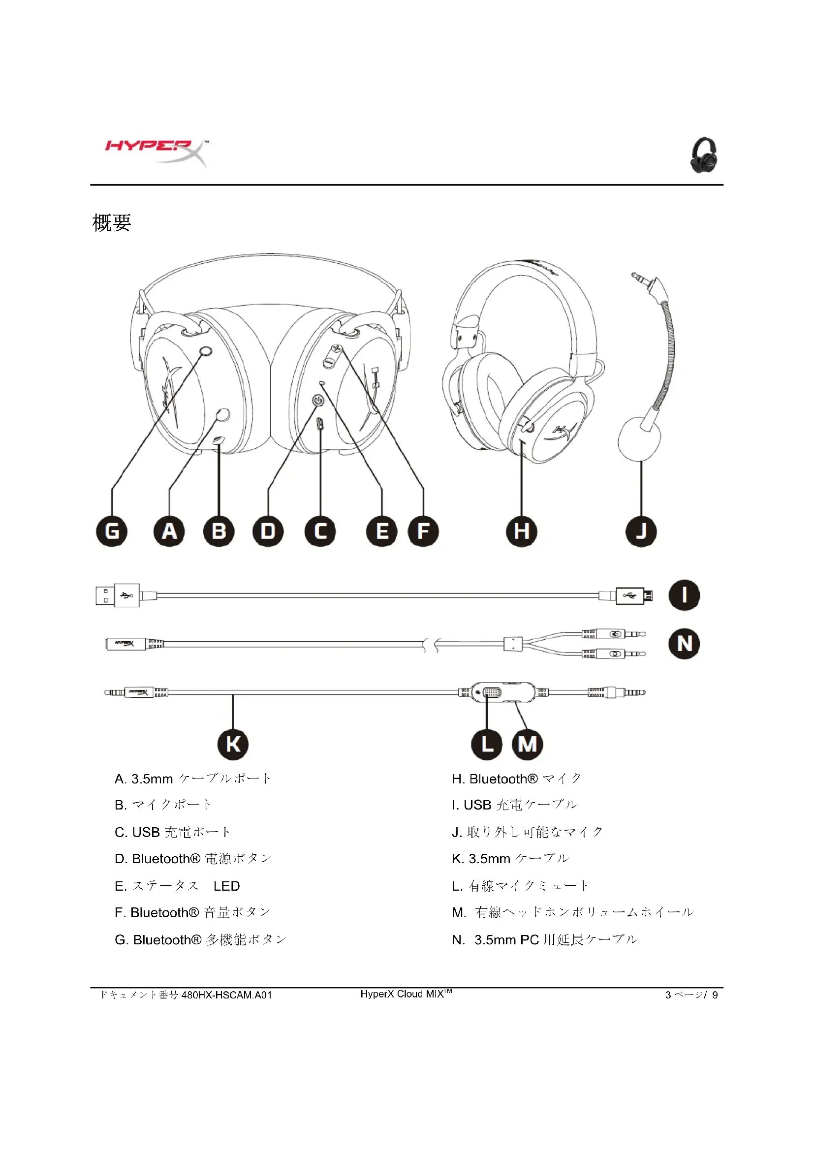 J. 取り外し可能なマイク K. 3.5mm ケーブル L. 有線マイクミュート M. 有線ヘッドホンボリュームホイール N. 3.5mm PC 用延長ケーブルドキュメント番号 480HX-HSCAM.A01 HyperX Cloud MIX