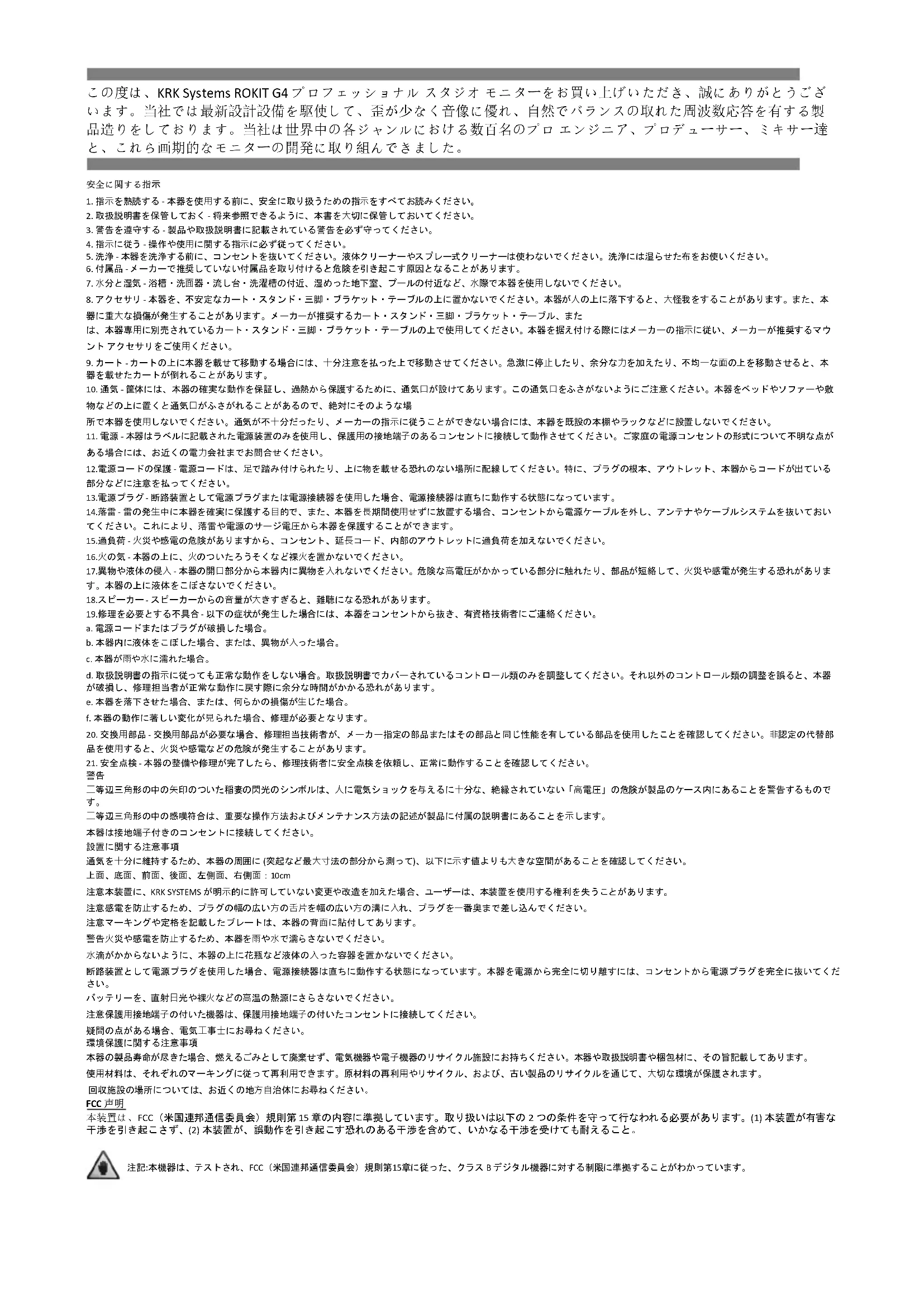 ⼆等辺三⾓形の中の⽮印のついた稲妻の閃光のシンボルは、⼈に電気ショックを与えるに⼗分な、絶縁されていない「⾼電圧」の危険が製品のケース内にあることを警告するもので ⼆等辺三⾓形の中の感嘆符合は、重要な操作⽅法およびメンテナンス⽅法の記述が製品に付属の説明書にあることを⽰します。 本器は接地端⼦付きのコンセントに接続してください。 設置に関する注意事項 通気を⼗分に維持するため、本器の周囲に (突起など最⼤⼨法の部分から測って)、以下に⽰す値よりも⼤きな空間があることを確認してください。 上⾯、底⾯、前⾯、後⾯、左側⾯、右側⾯:10cm 注意本装置に、KRK SYSTEMS が明⽰的に許可していない変更や改造を加えた場合、ユーザーは、本装置を使⽤する権利を失うことがあります。 注意感電を防⽌するため、プラグの幅の広い⽅の⾆⽚を幅の広い⽅の溝に⼊れ、プラグを⼀番奥まで差し込んでください。 注意マーキングや定格を記載したプレートは、本器の背⾯に貼付してあります。 警告⽕災や感電を防⽌するため、本器を⾬や⽔で濡らさないでください。 ⽔滴がかからないように、本器の上に花瓶など液体の⼊った容器を置かないでください。 断路装置として電源プラグを使⽤した場合、電源接続器は直ちに動作する状態になっています。本器を電源から完全に切り離すには、コンセントから電源プラグを完全に抜いてください。 バッテリーを、直射⽇光や裸⽕などの⾼温の熱源にさらさないでください。 注意保護⽤接地端⼦の付いた機器は、保護⽤接地端⼦の付いたコンセントに接続してください。 疑問の点がある場合、電気⼯事⼠にお尋ねください。 環境保護に関する注意事項 本器の製品寿命が尽きた場合、燃えるごみとして廃棄せず、電気機器や電⼦機器のリサイクル施設にお持ちください。本器や取扱説明書や梱包材に、その旨記載してあります。 使⽤材料は、それぞれのマーキングに従って再利⽤できます。原材料の再利⽤やリサイクル、および、古い製品のリサイクルを通じて、⼤切な環境が保護されます。 回収施設の場所については、お近くの地⽅⾃治体にお尋ねください。 FCC 声明 本装置は、FCC(米国連邦通信委員会)規則第 15 章の内容に準拠しています。取り扱いは以下の 2 つの条件を守って行なわれる必要があります。(1) 本装置が有害な 干渉を引き起こさず、(2) 本装置が、誤動作を引き起こす恐れのある干渉を含めて、いかなる干渉を受けても耐えること。
