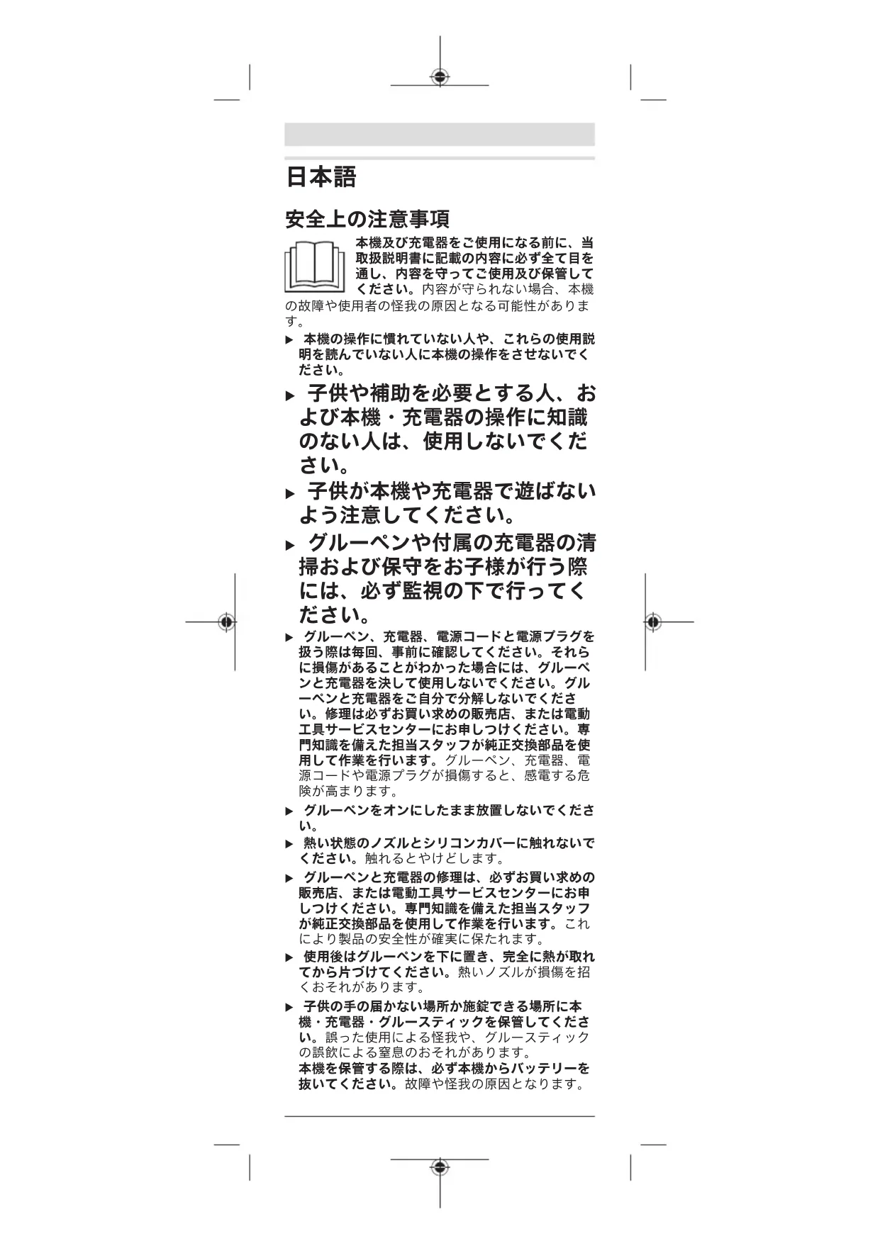 u 子供が本機や充電器で遊ばない よう注意してください。 u グルーペンや付属の充電器の清 掃および保守をお子様が行う際 には、必ず監視の下で行ってく
