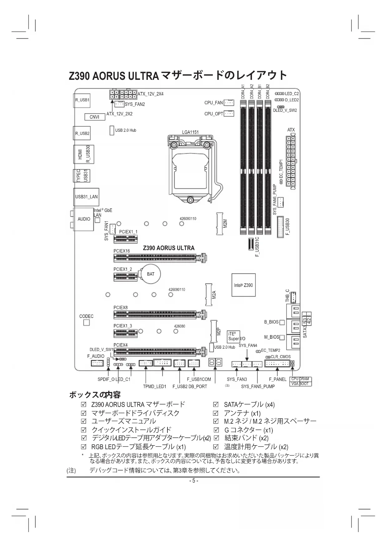 5 Z390 AORUS ULTRA マザーボード 5 SATAケーブル (x4) 5 マザーボードドライバディスク 5 アンテナ (x1) 5 ユーザーズマニュアル 5 M.2 ネジ / M.2 ネジ用スペーサー 5 クイックインストールガイド 5 G コネクター (x1) 5 デジタルLEDテープ用アダプターケーブル (x2) 5 結束バンド (x2) 5 RGB LEDテープ延長ケーブル (x1) 5 温度計用ケーブル (x2)