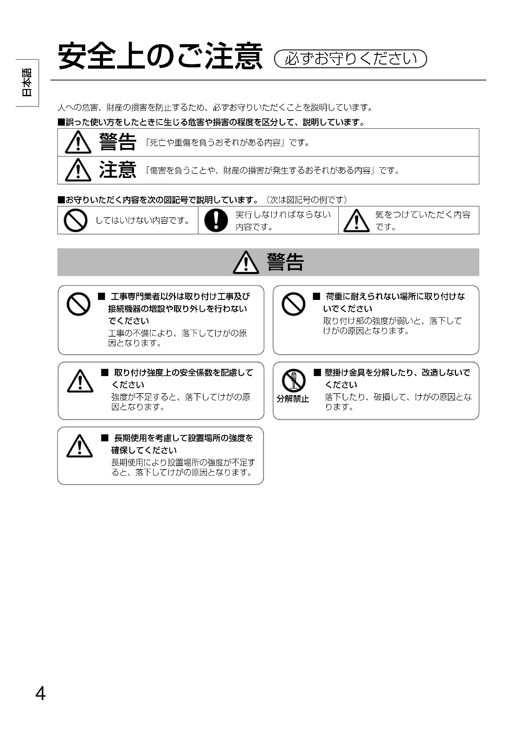 ■取り付け強度上の安全係数を配慮して 強度が不足すると、落下してけがの原因となります。人への危害、財産の損害を防止するため、必ずお守りいただくことを説明しています。■誤った使い方をしたときに生じる危害や損害の程度を区分して、説明しています。 「死亡や重傷を負うおそれがある内容」です。 「傷害を負うことや、財産の損害が発生するおそれがある内容」です。■お守りいただく内容を次の図記号で説明しています。(次は図記号の例です)してはいけない内容です。実行しなければならない内容です。気をつけていただく内容 ■荷重に耐えられない場所に取り付けないでください取り付け部の強度が弱いと、落下してけがの原因となります。
