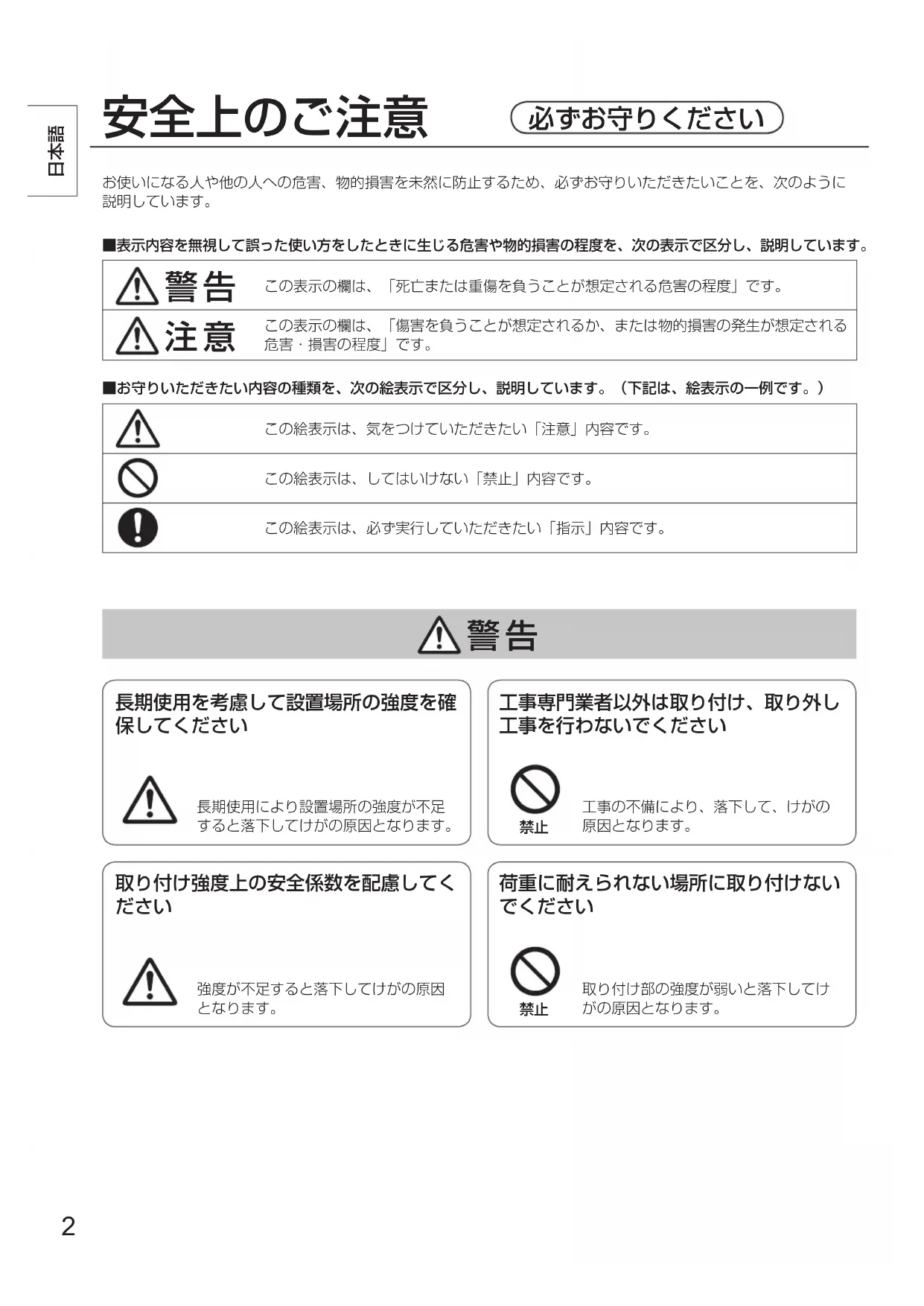 この表示の欄は、「傷害を負うことが想定されるか、または物的損害の発生が想定される危害・損害の程度」です。■お守りいただきたい内容の種類を、次の絵表示で区分し、説明しています。(下記は、絵表示の一例です。)この絵表示は、気をつけていただきたい「注意」内容です。この絵表示は、してはいけない「禁止」内容です。この絵表示は、必ず実行していただきたい「指示」内容です。お使いになる人や他の人への危害、物的損害を未然に防止するため、必ずお守りいただきたいことを、次のように説明しています。 取り付け強度上の安全係数を配慮してく