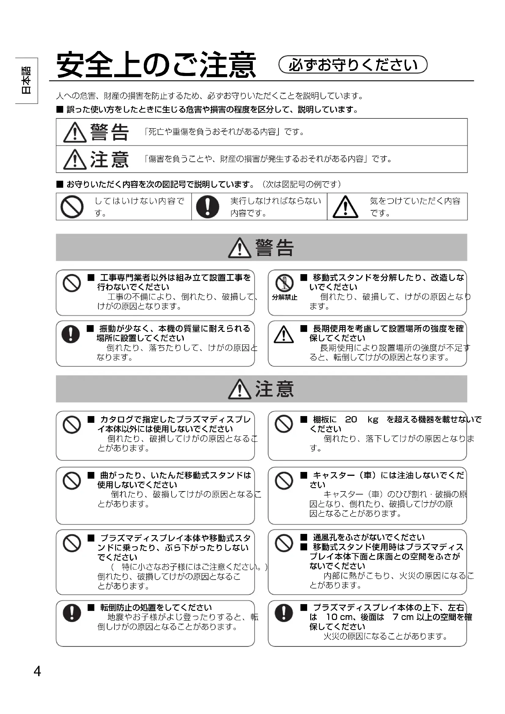 1)直射日光に当てたり、ストーブなどのそばに置くと、光や熱によって変色したり変形したりすることがあ りますのでご注意ください。 2)お手入れは、乾いた柔らかい布(綿・ネル地など)でふいてください。ひどく汚れているときは、水でう すめた中性洗剤で汚れを取ってから乾いた布でふいてください。なおベンジンやシンナー、家具用ワック スなどは、塗装がはげたりしますので、使用しないでください。 (プラズマディスプレイ本体のお手入れはプラズマディスプレイ本体の説明書に従ってください。化学ぞう きんをご使用の際は、その注意書に従ってください。) 3)粘着性のテープやシールを貼らないでください。移動式スタンド表面を汚すことがあります。また、ゴム やビニール製品などを長時間接触させないでください。 (変質の原因となります。) 4)プラズマディスプレイ本体のパネルは、ガラス製です。強い力や衝撃を加えないでください。 移動式スタンド組み立て設置工事上の留意点 ■プラズマディスプレイ本体の性能保証やトラブル防止のため、次の場所には設置しないでください。 ●スプリンクラーや感知器のそば ●振動や衝撃の加わるおそれのあるところ ●高圧線や動力源の近く ●磁気、熱、水蒸気、油煙などの発生源の近く ●暖房機器の風が当たるところ ●エアコンの下など水滴のかかるおそれのあるところ ■プラズマディスプレイ本体の電源プラグは、容易に手が届く位置の電源コンセントをご使用ください。 ■周囲温度が 40℃を超えることがないように空気の流通を確保してください。 プラズマディスプレイ本体内部に熱がこもり、故障の原因となることがあります。 ■取り付けねじや電源コードが、壁面の金属部と接触することがないように設置してください。 ■組み立て設置工事中に製品や床に傷が付かないよう、柔らかい毛布や布を使い作業してください。 ■組み立て設置工事は水平で平らな場所で行い、組み立て設置工事説明書に従ってください。 ■ねじ止めをするときは、締め付け不十分や締め付けすぎがないようにしてください。 ■設置時は、建築設備耐震設計・施工指針に従ってください。 ■組み立て設置工事や作業中の移動の際は、周囲の安全確保と十分な注意をしてください。 ■「安全上のご注意」をお読みいただき必ずお守りください。6