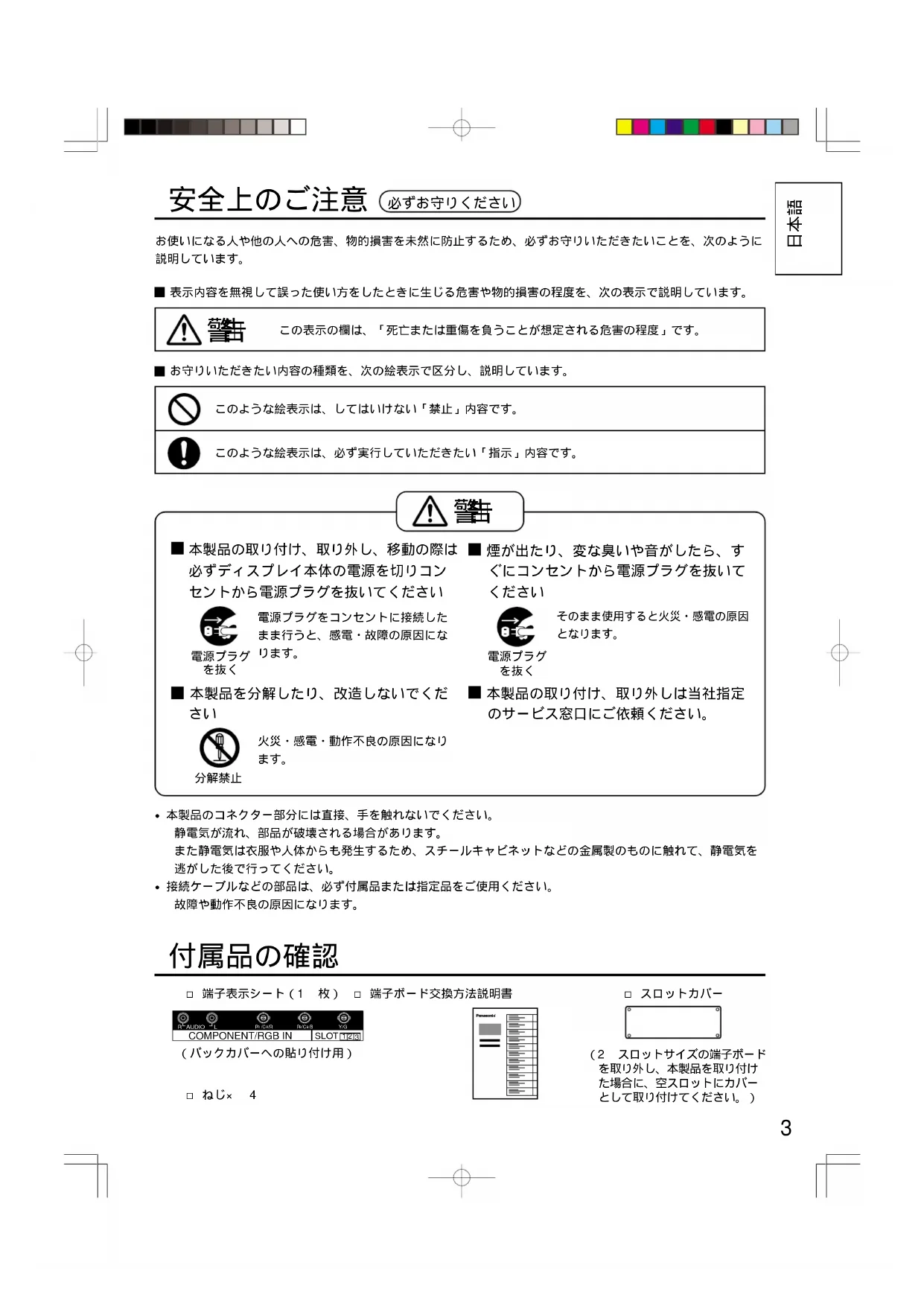 接続ケーブルなどの部品は、必ず付属品または指定品をご使用ください。 故障や動作不良の原因になります。 (バックカバーへの貼り付け用) 本製品の取り付け、取り外しは当社指定 のサービス窓口にご依頼ください。
