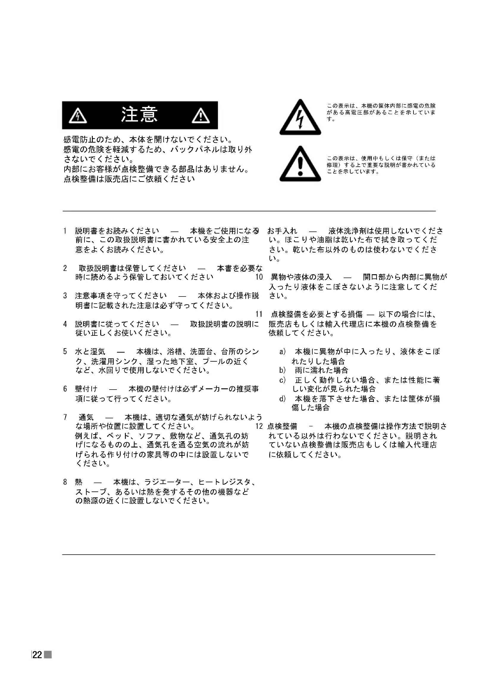 1 説明書をお読みください ― 本機をご使用になる 前に、この取扱説明書に書かれている安全上の注 意をよくお読みください。 2 取扱説明書は保管してください ― 本書を必要な 時に読めるよう保管しておいてください 3 注意事項を守ってください ― 本体および操作説 明書に記載された注意は必ず守ってください。 4 説明書に従ってください ― 取扱説明書の説明に 従い正しくお使いください。 5 水と湿気 ― 本機は、浴槽、洗面台、台所のシン ク、洗濯用シンク、湿った地下室、プールの近く など、水回りで使用しないでください。 6 壁付け ― 本機の壁付けは必ずメーカーの推奨事 項に従って行ってください。 7 通気 ― 本機は、適切な通気が妨げられないよう な場所や位置に設置してください。 例えば、ベッド、ソファ、敷物など、通気孔の妨 げになるものの上、通気孔を通る空気の流れが妨 げられる作り付けの家具等の中には設置しないで