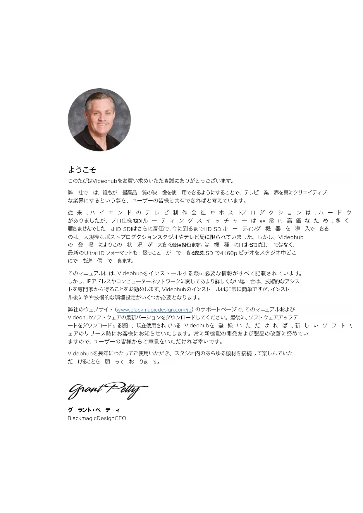 アドレスやコンピューターネットワークに関してあまり詳しくない場 合は、技術的なアシス トを専門家から得ることをお勧めします。Videohubのインストールは非常に簡単ですが、インストー ル後にやや技術的な環境設定がいくつか必要となります。 弊 社 の ウ ェ ブ サ イ ト( www.blackmagicdesign.com/jp)のサポートページで、このマニュアルおよび Videohub ソフトウェアの最新バージョンをダウンロードしてください。最後に、ソフトウェアアップデ ートをダウンロードする際に、現在使用されている Videohub を 登 録 い た だ け れ ば 、新 し い ソ フ ト ウ ェアのリリース時にお客様にお知らせいたします。常に新機能の開発および製品の改善に努めてい ますので、ユーザーの皆様からご意見をいただければ幸いです。 Videohubを長年にわたってご使用いただき、スタジオ内のあらゆる機材を接続して楽しんでいた だ けることを 願 って お りま す。 グ ラント・ペ テ ィ Blackmagic Design CEO目次 Blackmagic Videohubについて 97 はじめに 100 電源の接続 100 ビデオの接続 100 Videohub のコントロール 100 内蔵コントロールパネルでルーテ ィングの 切り替え
