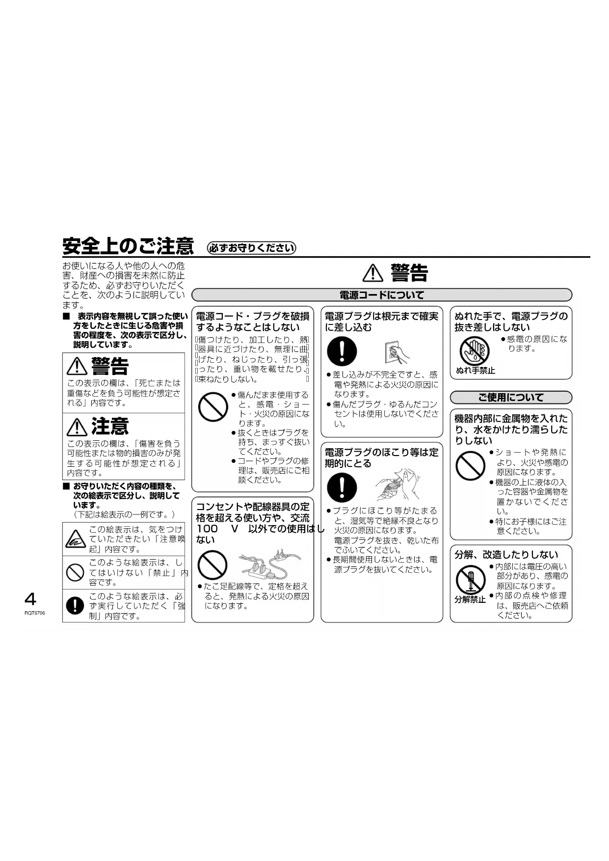 お使いになる人や他の人への危 害、財産への損害を未然に防止 するため、必ずお守りいただく ことを、次のように説明してい