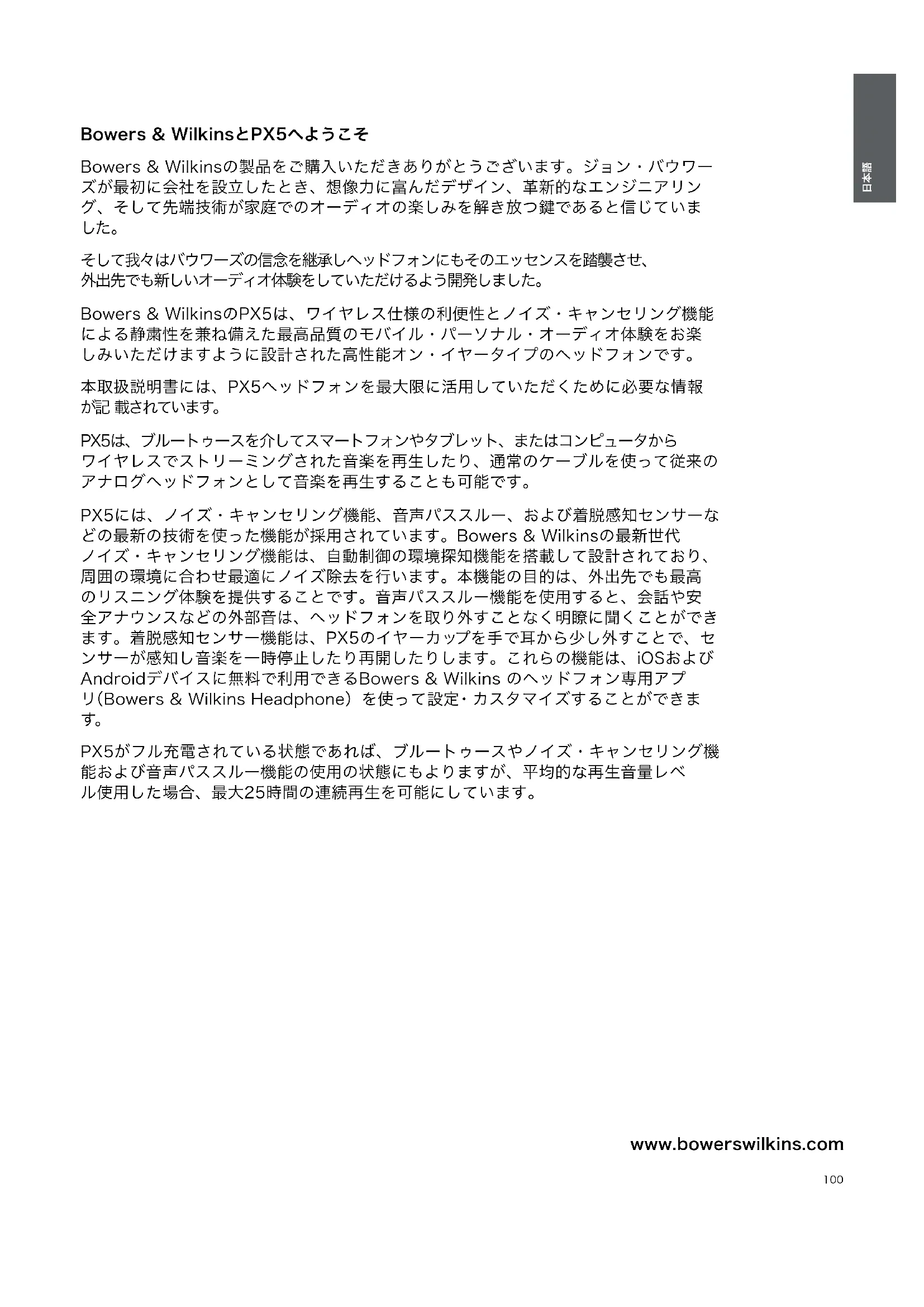 www.bowerswilkins.com Bowers & WilkinsとPX5へようこそ Bowers & Wilkinsの製品をご購入いただきありがとうございます。ジョン・バウワー ズが最初に会社を設立したとき、想像力に富んだデザイン、革新的なエンジニアリン グ、そして先端技術が家庭でのオーディオの楽しみを解き放つ鍵であると信じていま