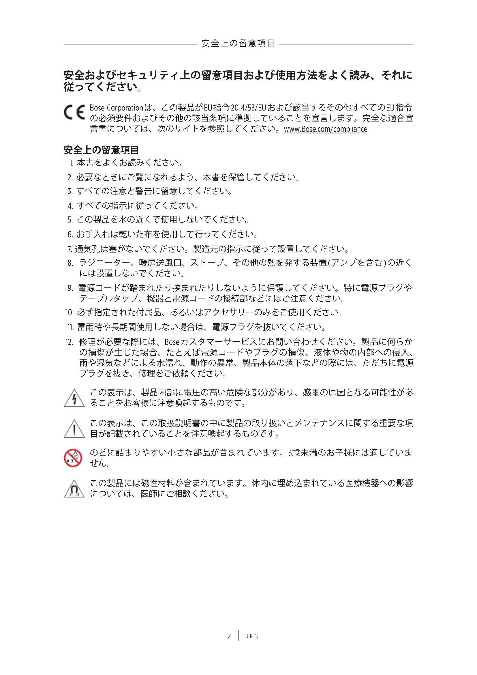 Bose Corporationは、この製品がEU指令2014/53/EUおよび該当するその他すべてのEU指令 の必須要件およびその他の該当条項に準拠していることを宣言します。完全な適合宣 言書については、次のサイトを参照してください。www.Bose.com/compliance