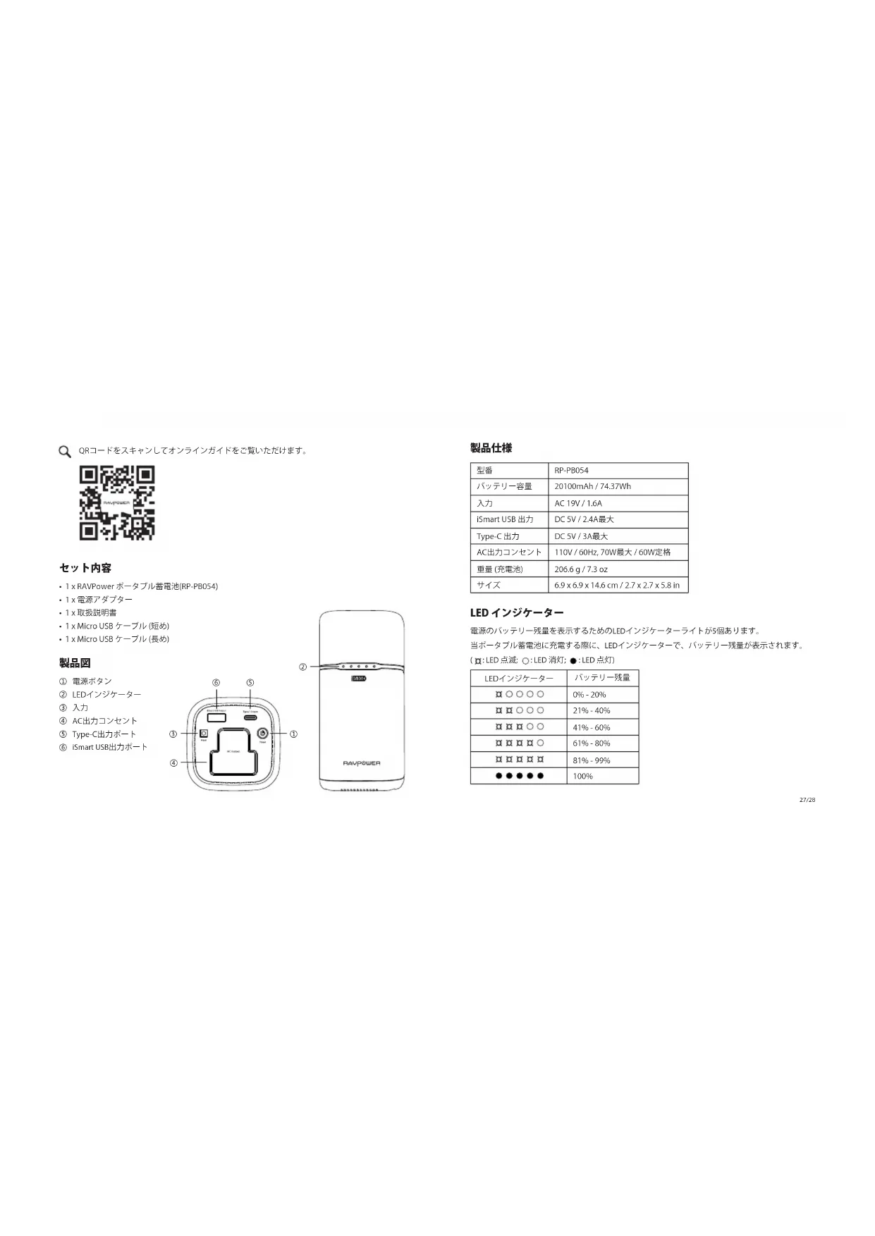 このたびは、RAVPowerPOWERSTATIONシリーズ20100mAhポータブル蓄電池 RP-PB054をお買い上げいただきまして誠にありがとうございます。取扱説明書をよくお 読みのうえ、正しく安全にお使いください。そして、今後の参考として、大切に保管し てください。使用中、何かご不明な点がございましたら、御遠慮なくカスタマーサポー トsupport@ravpower.jpにメールにてご連絡ください。 25/26