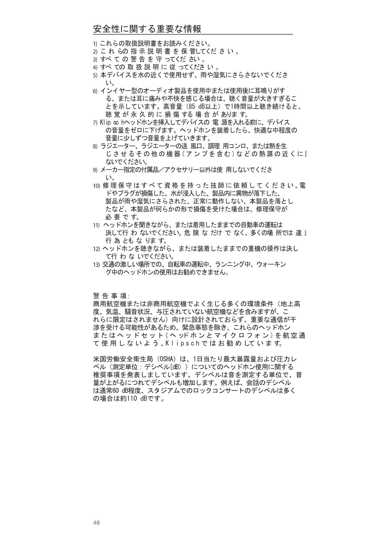 商用航空機または非商用航空機でよく生じる多くの環境条件(地上高 度、気温、騒音状況、与圧されていない航空機などを含みますが、こ れらに限定はされません)向けに設計されておらず、重要な通信が干 渉を受ける可能性があるため、緊急事態を除き、これらのヘッドホン ま た は ヘ ッ ド セ ッ ト( ヘ ッド ホ ン と マ イ ク ロ フ ォ ン )を 航 空 通 信 機 器 と し て 使 用 し な い よ う 、K l i p s c h で は お 勧 め して い ま す。 米国労働安全衛生局(OSHA)は、1日当たり最大暴露量および圧力レ ベル(測定単位:デシベル[dB))についてのヘッドホン使用に関する 推奨事項を発表しましています。デシベルは音を測定する単位で、音 量が上がるにつれてデシベルも増加します。例えば、会話のデシベル は通常60 dB程度、スタジアムでのロックコンサートのデシベルは多く の場合は約110 dBです。 安全性に関する重要な情報49 温圧レベル 推奨される最大暴露量 90dB 8時間 92dB 6時間 95dB 4時間 97dB 3時間 100dB 2時間 102dB 1.5時間 105dB 1時間 110dB 30分 115dB 15分以下 120dB 損傷が起きる可能性があ