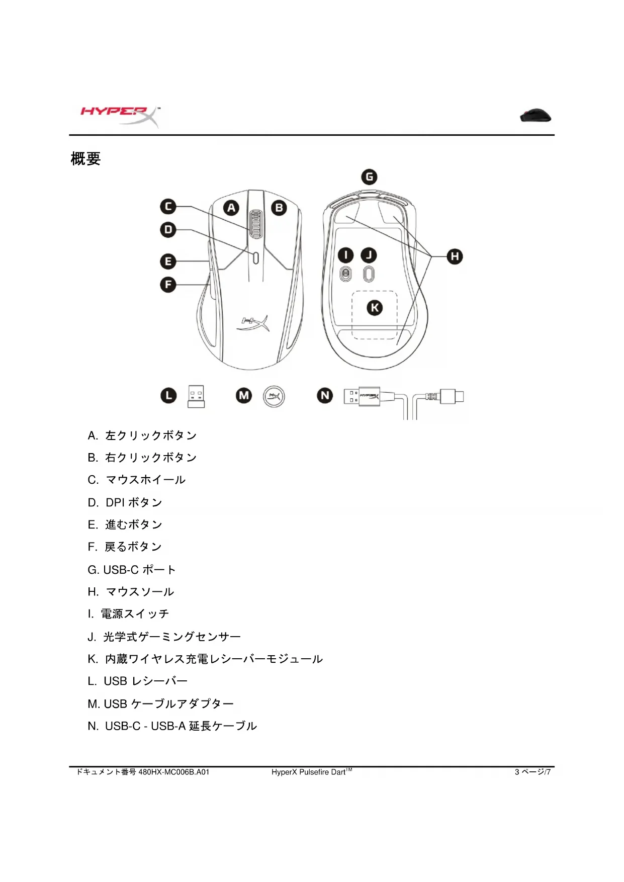 J. 光学式ゲーミングセンサー K. 内蔵ワイヤレス充電レシーバーモジュール L. USB レシーバー M. USB ケーブルアダプター N. USB-C - USB-A 延長ケーブルドキュメント番号 480HX-MC006B.A01 HyperX Pulsefire Dart