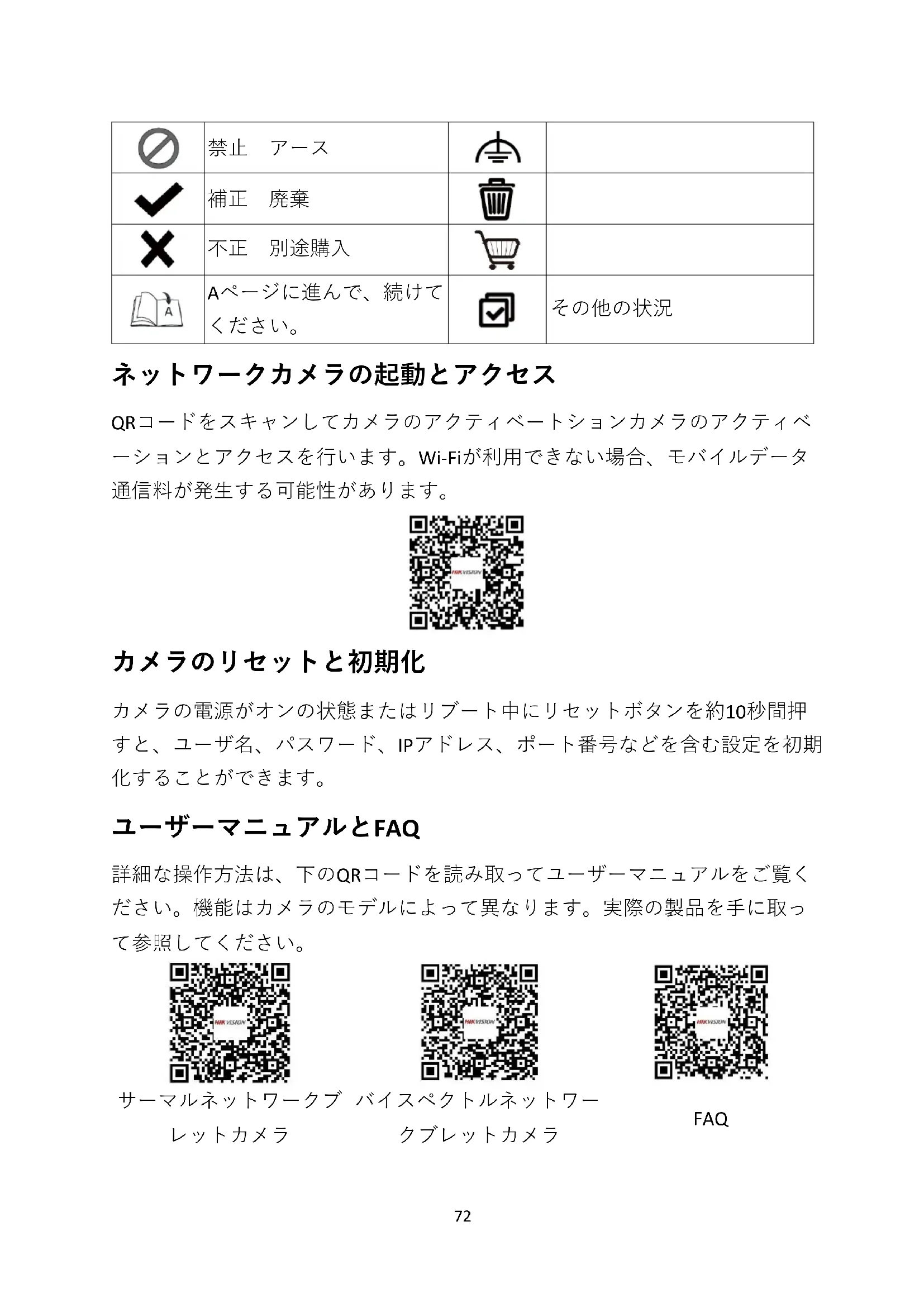 ネットワークカメラの起動とアクセス QRコードをスキャンしてカメラのアクティベートションカメラのアクティベ ーションとアクセスを行います。Wi-Fiが利用できない場合、モバイルデータ 通信料が発生する可能性があります。 カメラのリセットと初期化 カメラの電源がオンの状態またはリブート中にリセットボタンを約10秒間押 すと、ユーザ名、パスワード、IPアドレス、ポート番号などを含む設定を初期 化することができます。 ユーザーマニュアルとFAQ 詳細な操作方法は、下のQRコードを読み取ってユーザーマニュアルをご覧く ださい。機能はカメラのモデルによって異なります。実際の製品を手に取っ