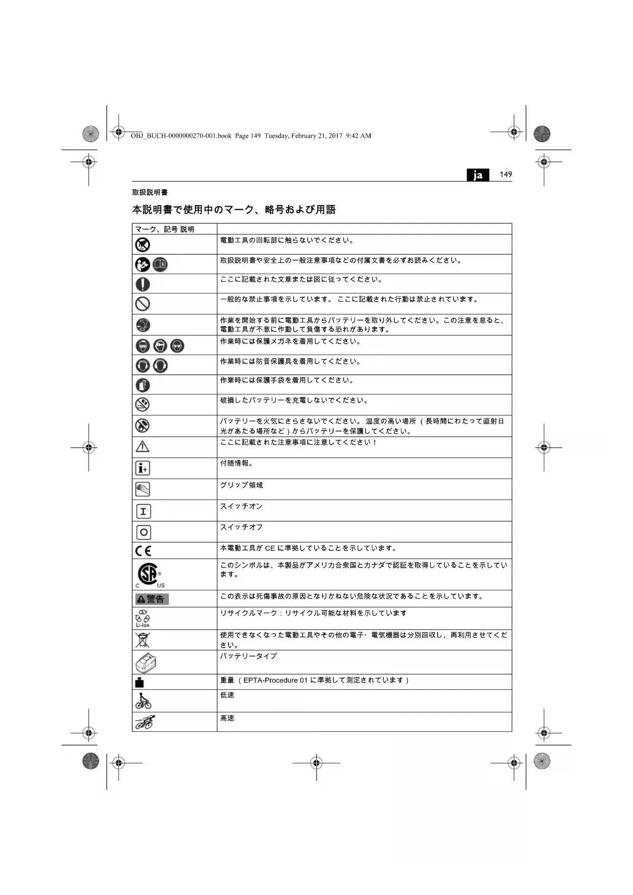 電動工具の回転部に触らないでください。 取扱説明書や安全上の一般注意事項などの付属文書を必ずお読みください。 ここに記載された文章または図に従ってください。 一般的な禁止事項を示しています。 ここに記載された行動は禁止されています。 作業を開始する前に電動工具からバッテリーを取り外してください。この注意を怠ると、 電動工具が不意に作動して負傷する恐れがあります。 作業時には保護メガネを着用してください。 作業時には防音保護具を着用してください。 作業時には保護手袋を着用してください。 破損したバッテリーを充電しないでください。 バッテリーを火気にさらさないでください。 温度の高い場所 (長時間にわたって直射日 光があたる場所など)からバッテリーを保護してください。 ここに記載された注意事項に注意してください!