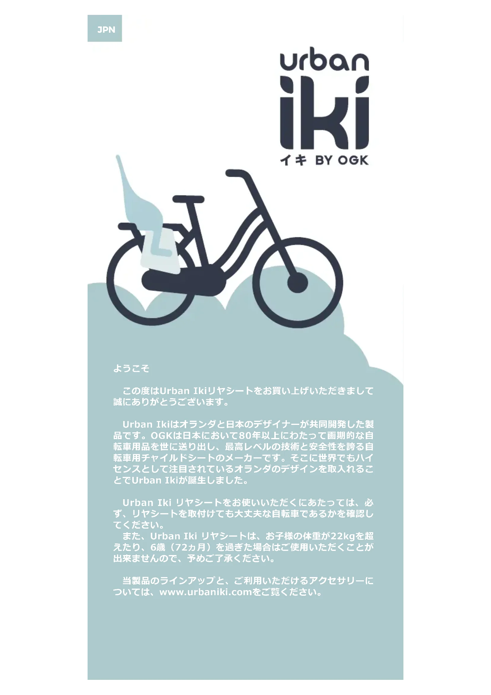 この度はUrban Ikiリヤシートをお買い上げいただきまして 誠にありがとうございます。 Urban Ikiはオランダと日本のデザイナーが共同開発した製 品です。OGKは日本において80年以上にわたって画期的な自 転車用品を世に送り出し、最高レベルの技術と安全性を誇る自 転車用チャイルドシートのメーカーです。そこに世界でもハイ センスとして注目されているオランダのデザインを取入れるこ とでUrban Ikiが誕生しました。 Urban Iki リヤシートをお使いいただくにあたっては、必 ず、リヤシートを取付けても大丈夫な自転車であるかを確認し