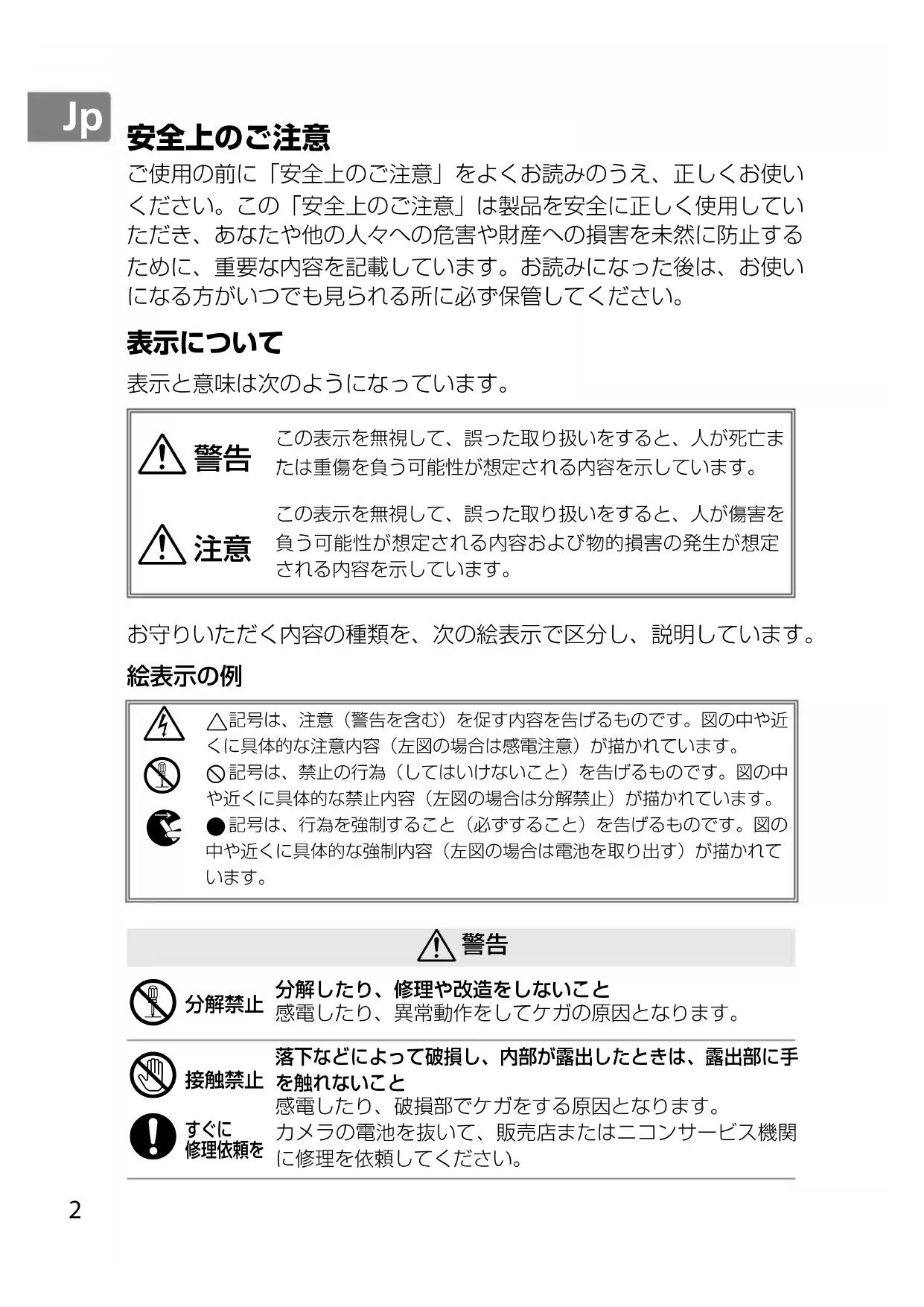 熱くなる、煙が出る、こげ臭いなどの異常時は、速やか にカメラの電池を取り出すこと そのまま使用すると火災、やけどの原因となります。 電池を取り出す際、やけどに充分注意してください。 電池を抜いて、販売店またはニコンサービス機関に修理を