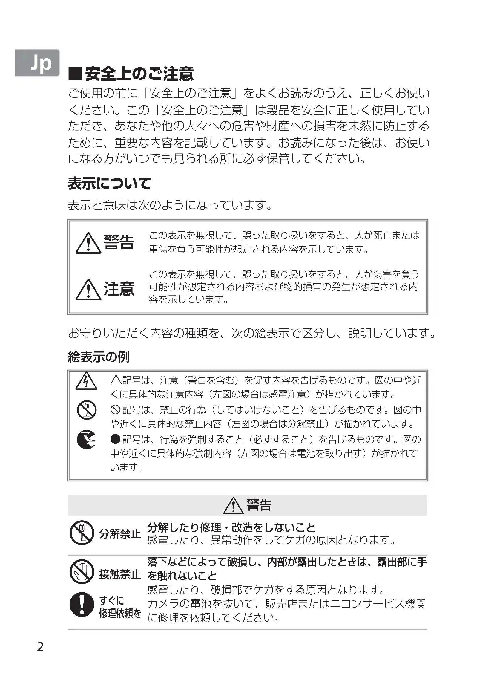 熱くなる、煙が出る、こげ臭いなどの異常時は、速やか にカメラの電池を取り出すこと そのまま使用すると火災、やけどの原因となります。 電池を取り出す際、やけどに充分注意してください。 電池を抜いて、販売店またはニコンサービス機関に修理を