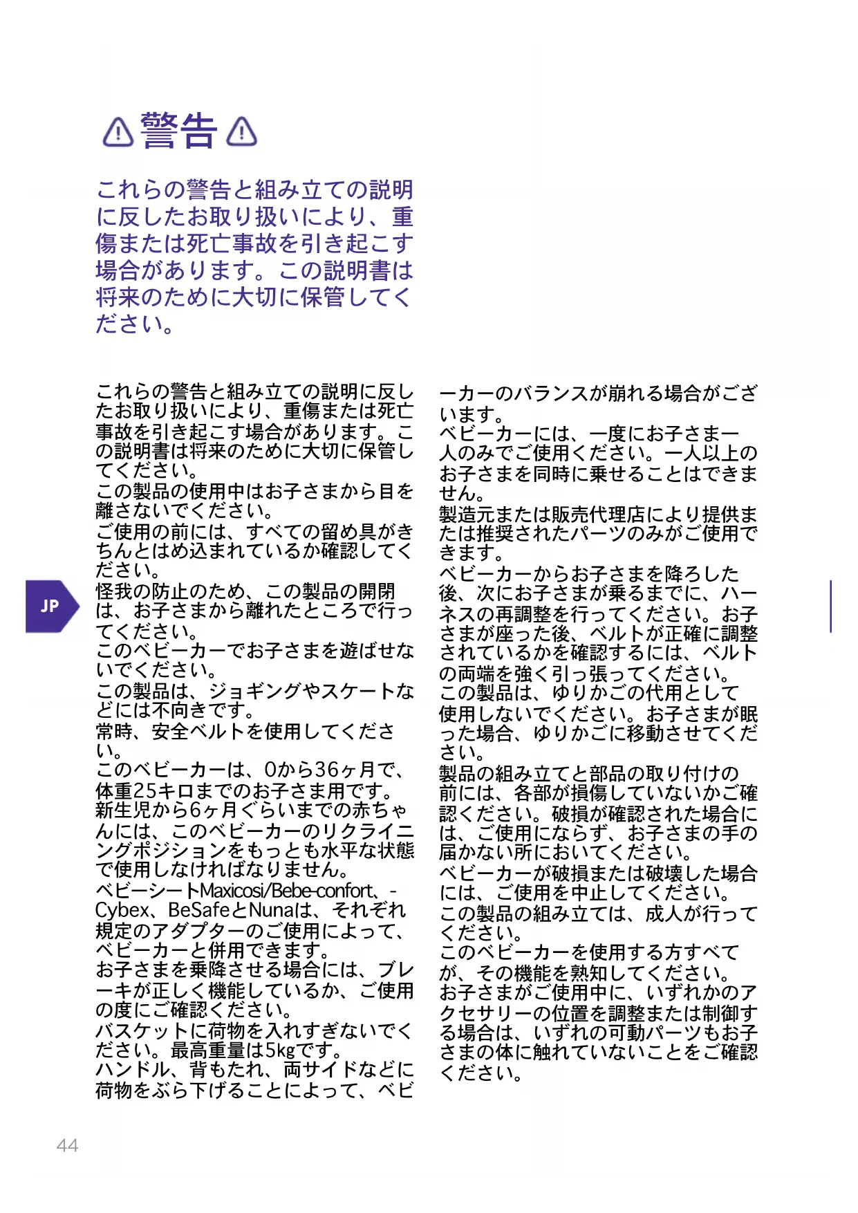 このベビーカーは、0から36ヶ月で、 体重25キロまでのお子さま用です。 新生児から6ヶ月ぐらいまでの赤ちゃ んには、このベビーカーのリクライニ ングポジションをもっとも水平な状態 で使用しなければなりません。 ベビーシートMaxicosi/Bebe-confort、- Cybex、BeSafeとNunaは、それぞれ 規定のアダプターのご使用によって、 ベビーカーと併用できます。 お子さまを乗降させる場合には、ブレ ーキが正しく機能しているか、ご使用 の度にご確認ください。 バスケットに荷物を入れすぎないでく ださい。最高重量は5㎏です。 ハンドル、背もたれ、両サイドなどに 荷物をぶら下げることによって、ベビ ーカーのバランスが崩れる場合がござ