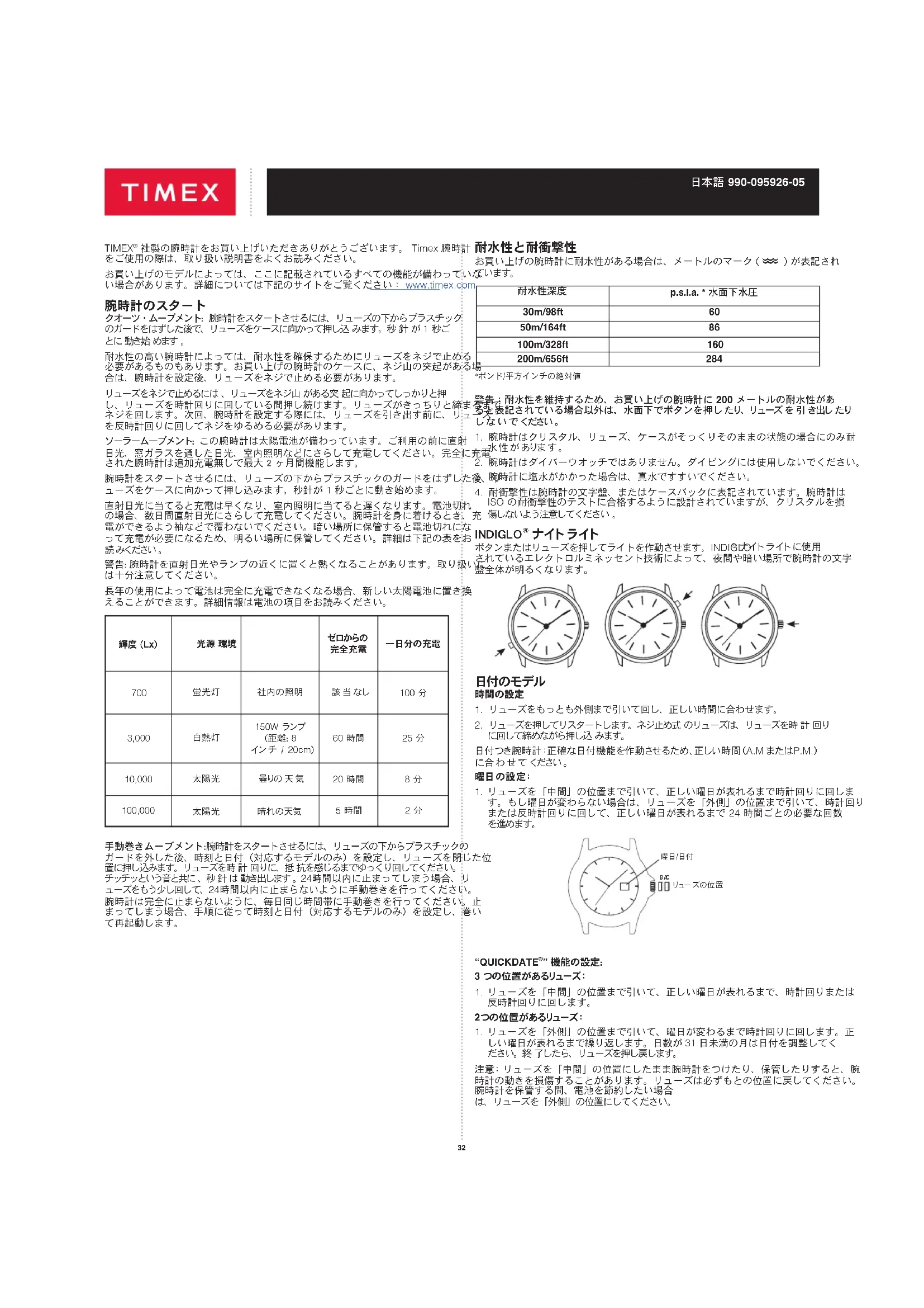 WED 14 日付の確認 (工場使用のみ)時間、曜日 日付の設定中間 外側時間の設定時間を設定するには、リューズをもっとも外側まで引き出して回します。曜日と日付は、真夜中を過ぎて時間を設定すると自動的に変わります。曜日と日付の設定は必要ありません。終 了したらリューズを押し戻します。設定の後で、もし日付が正午に変わったら、時間を 12 時間前か後ろに進めて調整 する 必 要 が ありま す 。 もし間違ってリューズを「中間」の位置にして回すと、日付の表示が一時的に変わりますが、日付の設定には影響ありません。リューズをもっとも「外側」まで引き出し、時間を設定します。正しい日付の表示が戻ります。永久カレンダー時計 一生無料電池交換**腕時計の電池の交換が必要な場合は、TIMEX で交換するようにお勧めします。お客様の腕時計は、電池の交換後、正しい時間と日付に合わせるよう再調整する必要があります。腕時計をTIMEXへ送るには、利用した小売店に問い合わせるか、 www.timexwatch.jp/fs/timex/c/guide#returns のTIMEX問い合わせ情報をご参照 く だ さ い 。 ** 発送諸経費は適用されます。 腕時計と一緒に特製のバンドや個人的な飾りなどを送ることは絶対にしないでくだ 経 過 タ イ ムリン グお買い上げの腕時計の文字盤の外側に回転式リングがあり、分と対応する数字がある場合、これを経過タイムリングとして使うことができ、アクティビティのスタートからの経過タイムを計測、またはアクティビティの終わりのタイムをマークすることができます。アクティビティをスタートから計るには:アクティビティを開始するときに、その時間(時刻または分)にスタート/ストップのトライアングルを設定します(下記の左図を参照)。終了したとき、そのアクティビティがどのぐらいかかった かを 見ます。 日本語 990-095926-0534 残 りの タ イム を 計 る に は: アクティビティを終了したい時刻または分の位置にトライアングルを設定し、ゴール に向かっての進行状況をときどきチェックします。 前ページの右図に示されたように、分針が 12 時 の 位 置 から 20 分 過 ぎ た と き 、ア ク テ ィビ テ ィを 止 め ま す 。 タ キ メー ターリン グ タキメーターの機能は、秒針と腕時計の文字盤の上のスケールを使って、1 時間に何 マ イ ル( MPH)、1 時間に何海里(knots)ま た は 1 時 間 に 何 キ ロ メ ー ト ル( KPH)進 む かのスピードを計ることができます。これには計測する実際の距離をマイルまたはキ ロメート ル で 知 っ て お く必 要 が ありま す 。 ク ロ ノ グ ラ フ の 秒 針 を ゼ ロ( 12 時 の 位 置 )に し て ス タ ー ト し ま す 。1 分以内に、秒針が 1 マイル(または 1 キ ロ メート ル )コー ス のレ ート を 指 し ま す 。もし 45 秒 かかったとす る と 、針 は 80 を指します – 80 MPH または 80 KPH と なります 。 最初の 1 分以内で、1 マイルまたは 1 キロメートル以上を計測する場合、正確なレー トを得るには、タキメーターの数に距 離をかけます:例えば 1.2 マイル を 45 秒で進 んだ場合、80 に 1.2 をかけて – 96 MPH と なります 。