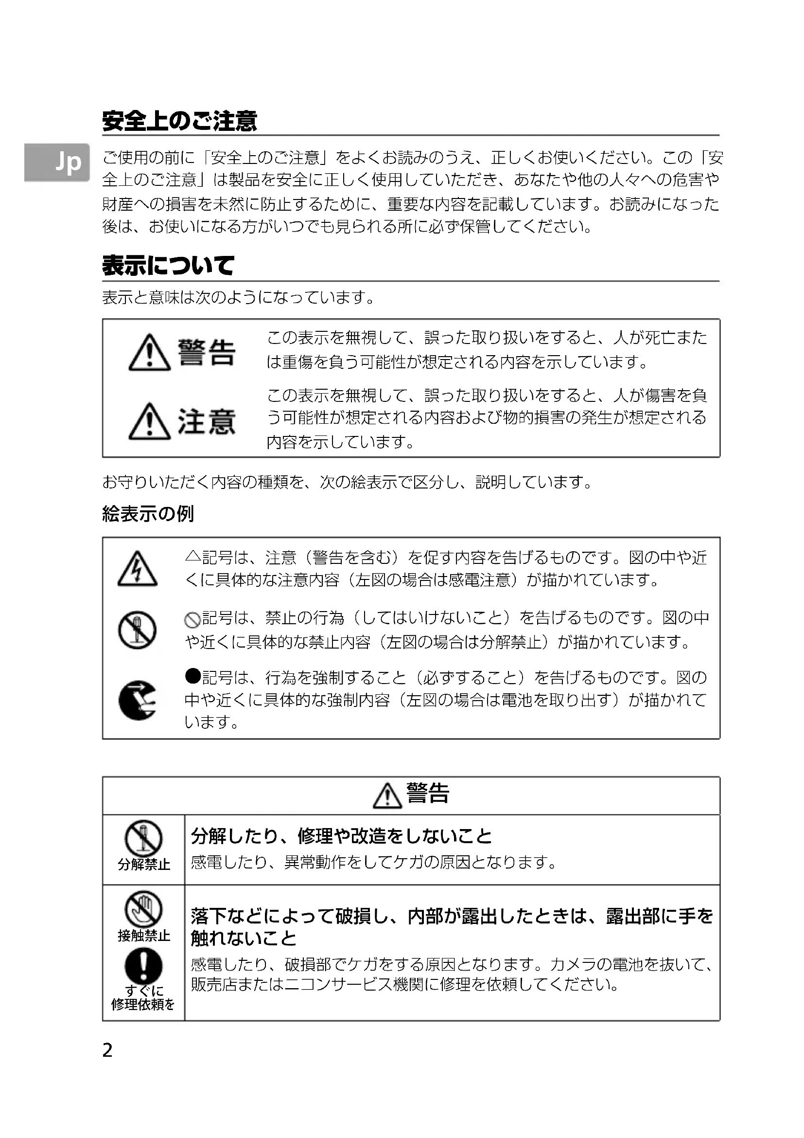使用説明書の内容が破損などによって 判読できなくなったときは、 ニコンサービス機関にて新しい使用説明書をお求め下さい(有料)。 No reproduction in any form of this manual, in whole or in part (except for brief quotation in critical articles or reviews), may be made without written authorization from NIKON CORPORATION. Avis pour les clients en FranceJp-10 10 ご使用の前に「安全上のご注意」をよくお読みのうえ、正しくお使いください。この「安全上のご注意」は製品を安全に正しく使用していただき、あなたや他の人々への危害や財産への損害を未然に防止するために、重要な内容を記載しています。お読みになった後は、お使いになる方がいつでも見られる所に必ず保管してください。 表示と意味は次のようになっています。この表示を無視して、誤った取り扱いをすると、人が死亡または重傷を負う可能性が想定される内容を示しています。この表示を無視して、誤った取り扱いをすると、人が傷害を負う可能性が想定される内容および物的損害の発生が想定される内容を示しています。お守りいただく内容の種類を、次の絵表示で区分し、説明しています。