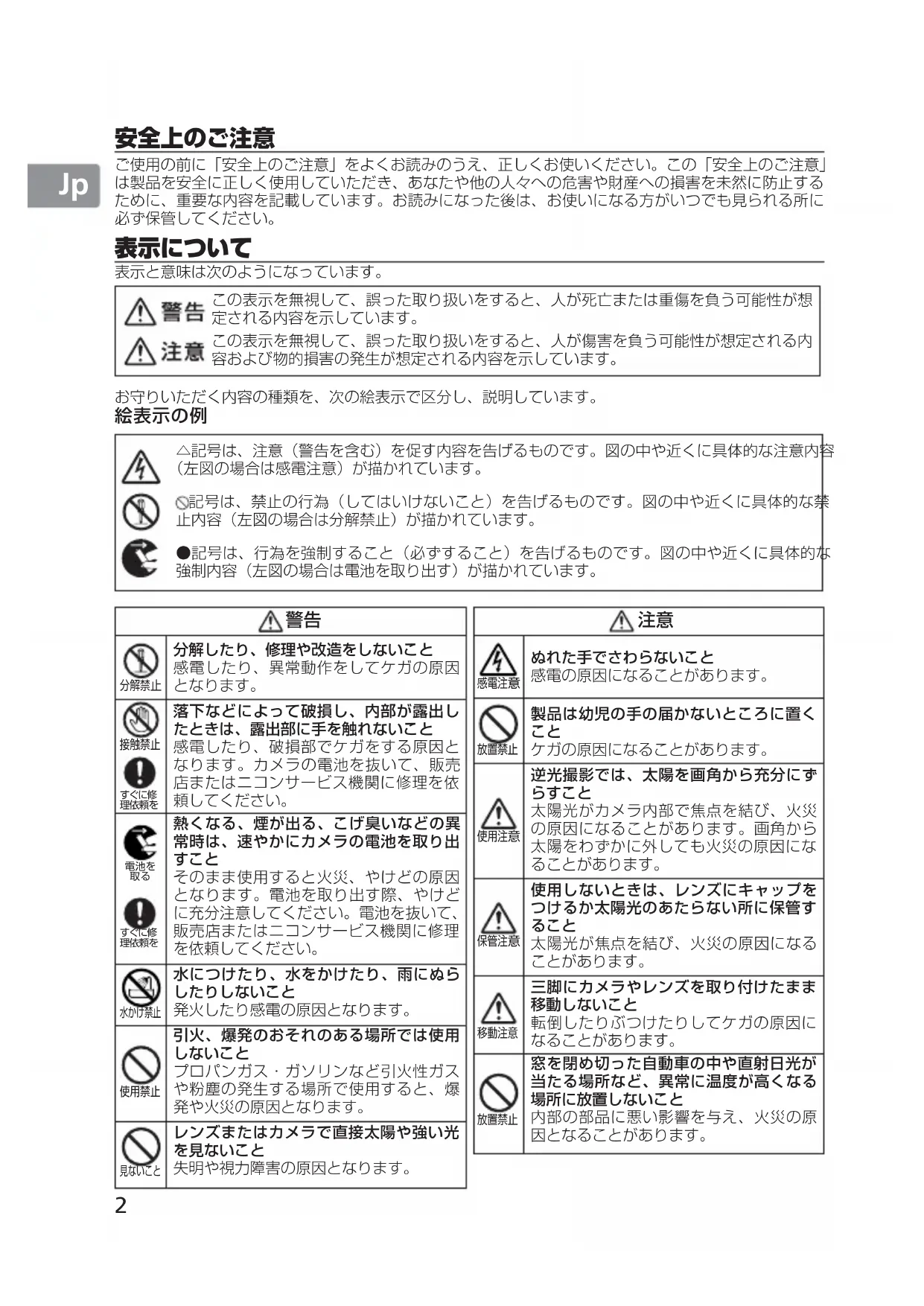 落下などによって破損し、内部が露出し たときは、露出部に手を触れないこと 感電したり、破損部でケガをする原因と なります。カメラの電池を抜いて、販売 店またはニコンサービス機関に修理を依
