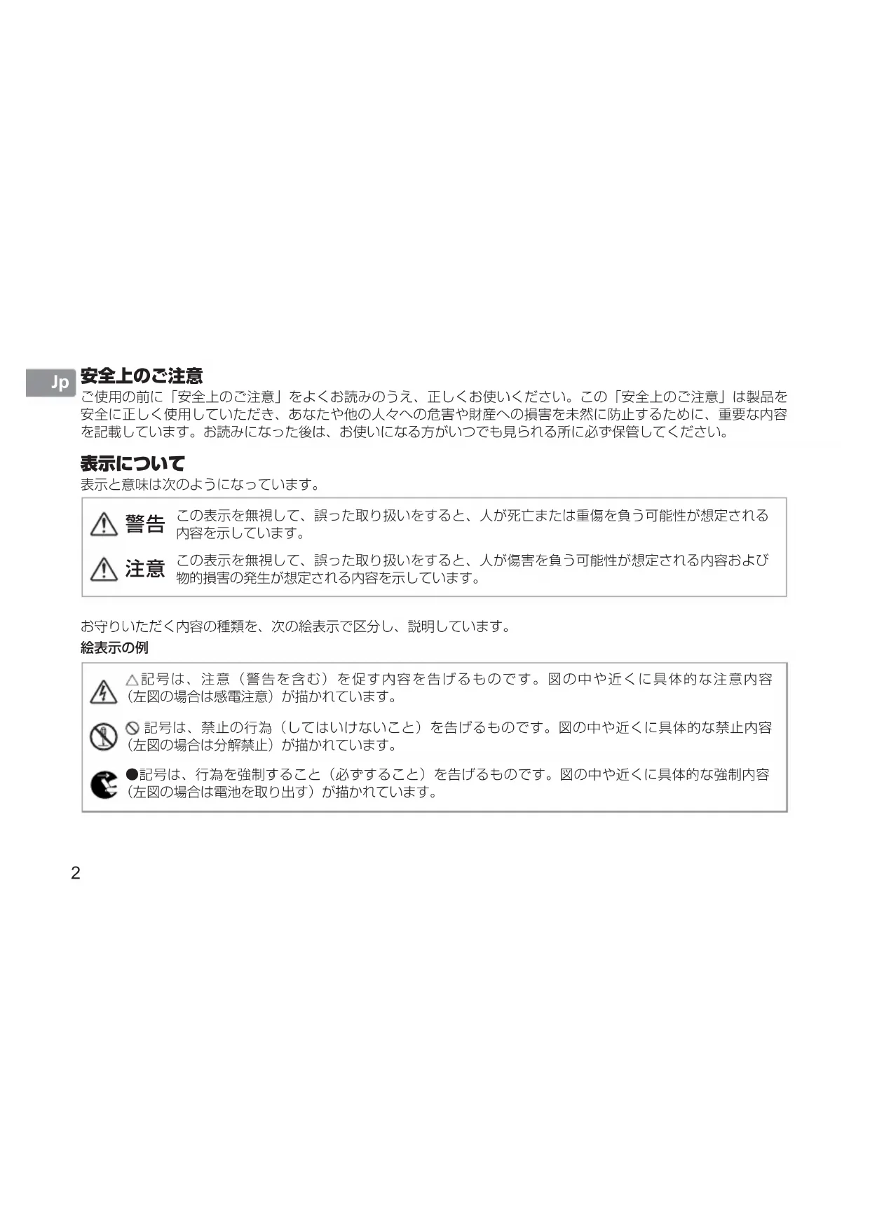 ご使用の前に「安全上のご注意」をよくお読みのうえ、正しくお使いください。この「安全上のご注意」は製品を 安全に正しく使用していただき、あなたや他の人々への危害や財産への損害を未然に防止するために、重要な内容 を記載しています。お読みになった後は、お使いになる方がいつでも見られる所に必ず保管してください。