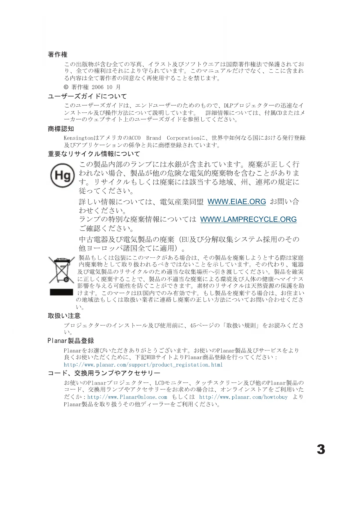 KensingtonはアメリカのACCO Brand Corporationに、世界中如何なる国における発行登録 及びアプリケーションの係争と共に商標登録されています。 重要なリサイクル情報について この製品内部のランプには水銀が含まれています。廃棄が正しく行 われない場合、製品が他の危険な電気的廃棄物を含むことがありま す。リサイクルもしくは廃棄には該当する地域、州、連邦の規定に