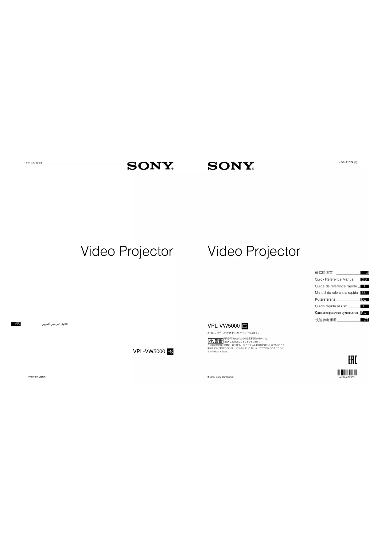 VPL-VW50004-584-920-09(1) D:\Works\4584920091\4584920091VPLVW5000E33\01JP-VPLVW5000ES\010COV.fm masterpage: Cover VPL-VW5000 4-584-920-09 (1) Video Projector 4-584-920-09 (1)© 2016 Sony Corporation お買い上げいただきありがとうございます。 電気製品は安全のための注意事項を守らないと、火災や人身事故になることがあります。この簡易説明書と付属の CD-ROM に入っている取扱説明書をよくお読みのうえ、製品を安全にお使いください。お読みになったあとは、いつでも見られるところに必ず保管してください。 VPL-VW5000 簡易説明書 JP Quick Reference Manual ___ GB Guide de reference rapide _ FR Manual de referencia rapida _ ES Kurzreferenz______________ DE Guida rapida all'uso _______ IT Краткое справочное руководство _ RU
