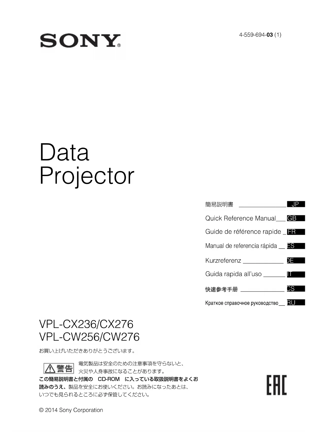 4-559-694-03 (1) © 2014 Sony Corporation Data Projector VPL-CX236/CX276 VPL-CW256/CW276 お買い上げいただきありがとうございます。 電気製品は安全のための注意事項を守らないと、 火災や人身事故になることがあります。 この簡易説明書と付属の CD-ROM に入っている取扱説明書をよくお 読みのうえ、製品を安全にお使いください。お読みになったあとは、 いつでも見られるところに必ず保管してください。 簡易説明書 JP Quick Reference Manual___ GB Guide de référence rapide _ FR Manual de referencia rápida __ ES Kurzreferenz _____________ DE Guida rapida all’uso _______ IT ______________ CS Краткое справочное руководство __ RUJP
