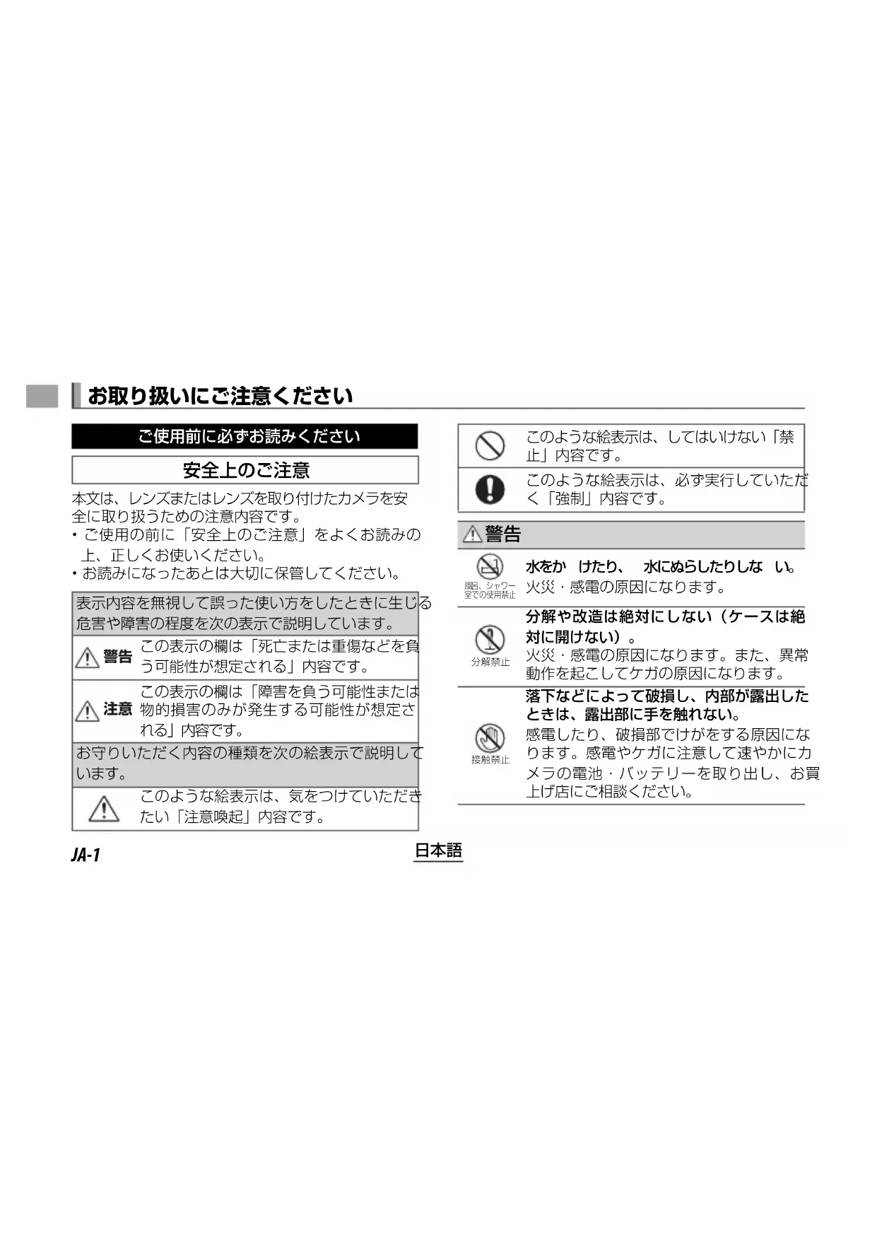 落下などによって破損し、内部が露出した ときは、露出部に手を触れない。 感電したり、破損部でけがをする原因にな ります。感電やケガに注意して速やかにカ メラの電池・バッテリーを取り出し、お買 上げ店にご相談ください。 お取り扱いにご注意くださいJA-2
