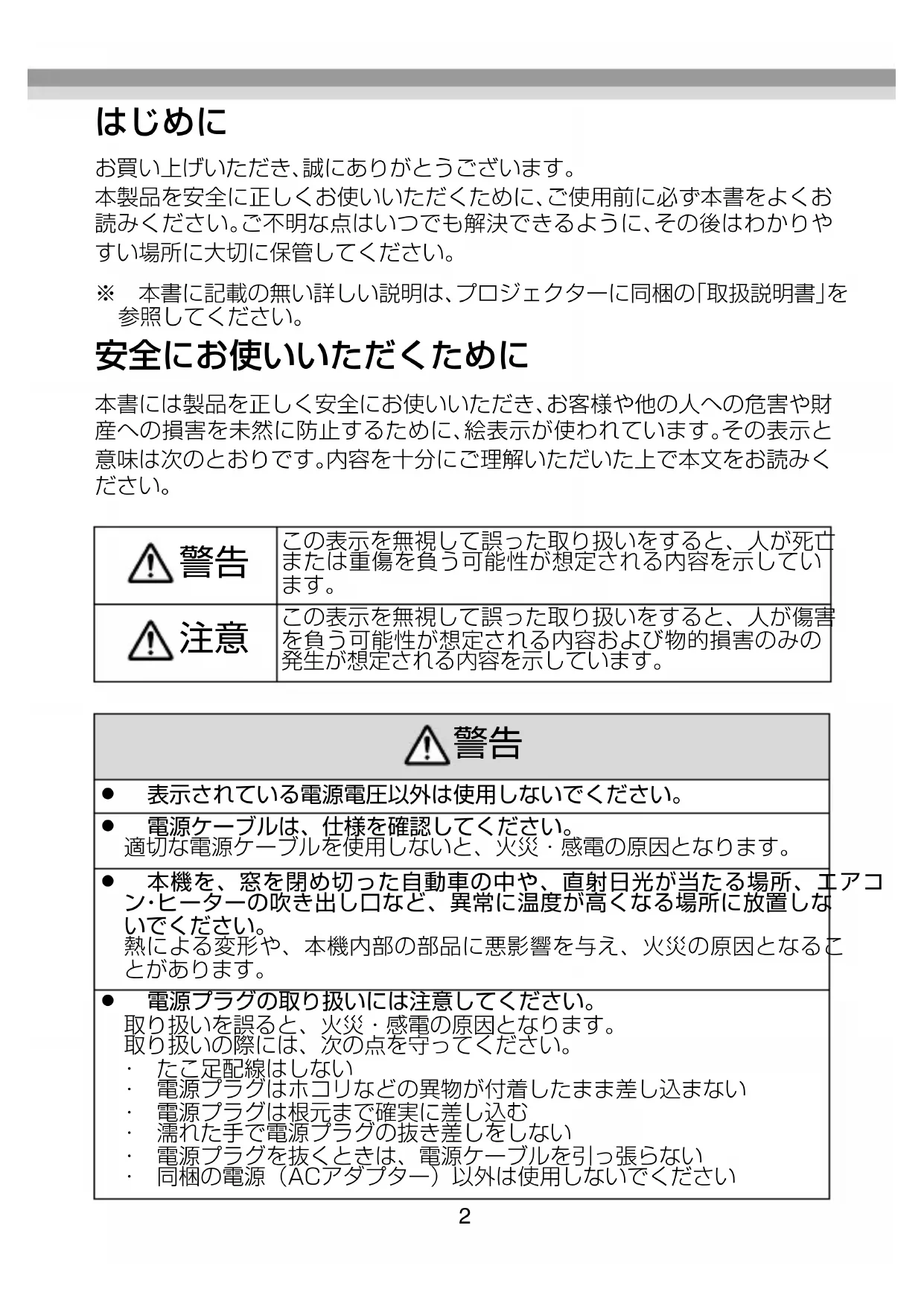 お買い上げいただき、誠にありがとうございます。 本製品を安全に正しくお使いいただくために、ご使用前に必ず本書をよくお 読みください。ご不明な点はいつでも解決できるように、その後はわかりや すい場所に大切に保管してください。 ※ 本書に記載の無い詳しい説明は、プロジェクターに同梱の「取扱説明書」を