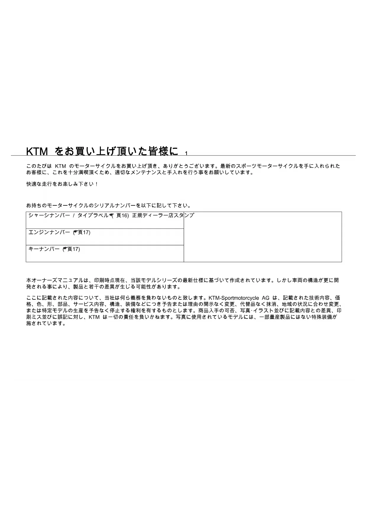 OWNER'S MANUAL 2012 990 Super Duke FR 990 Super Duke R EU 990 Super Duke R AUS/UK 990 Super Duke R FR ART. NO. 3211796jaKTM をお買い上げ頂いた皆様に 1 KTM をお買い上げ頂いた皆 様に このたびは KTM のモーターサイクルをお買い上げ頂き、ありがとうございます。最新のスポーツモーターサイクルを手に入れられた お客様に、これを十分満喫頂くため、適切なメンテナンスと手入れを行う事をお願いしています。 快適な走行をお楽しみ下さい! お持ちのモーターサイクルのシリアルナンバーを以下に記して下さい。 シャーシナンバー / タイプラベル ( 頁16) 正規ディーラー店スタンプ エンジンナンバー ( 頁17) キーナンバー ( 頁17) 本オーナーズマニュアルは、印刷時点現在、当該モデルシリーズの最新仕様に基づいて作成されています。しかし車両の構造が更に開 発される事により、製品と若干の差異が生じる可能性があります。 ここに記載された内容について、当社は何ら義務を負わないものと致します。KTM-Sportmotorcycle AG は、記載された技術内容、価 格、色、形、部品、サービス内容、構造、装備などにつき予告または理由の開示なく変更、代替品なく抹消、地域の状況に合わせ変更、 または特定モデルの生産を予告なく停止する権利を有するものとします。商品入手の可否、写真・イラスト並びに記載内容との差異、印 刷ミス並びに誤記に対し、KTM は一切の責任を負いかねます。写真に使用されているモデルには、一部量産製品にはない特殊装備が 施されています。KTM をお買い上げ頂いた皆様に 2 © 2011 KTM-Sportmotorcycle AG、Mattighofen オーストリア 無断複写・転載を禁じます。 一部または全部並びにその種類を問わず、複製・複写には必ず著作者の書面による許可を要します。 ISO 9001(12 100 6061) 国際品質管理規格 ISO 9001 の観点から、KTM では到達しうる最高の生産品質を実現するための品質保証プロセスを導
