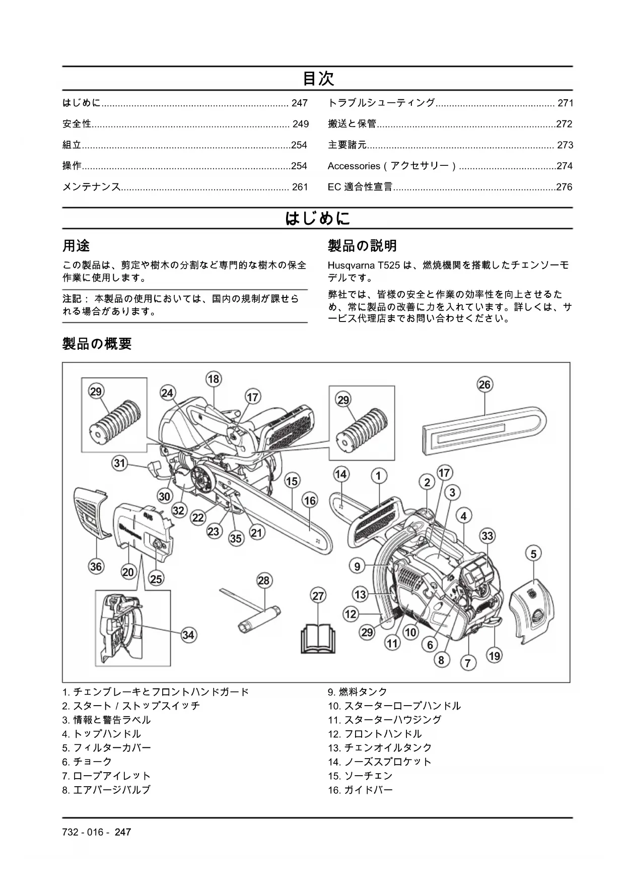 - 輸送または長期保管する前に燃料タンクおよびチェ ンオイルタンクを空にしてください。燃料とチェン オイルは適切な廃棄場所に廃棄してください。 272 732 - 016 -• 製品が傷ついたり損傷したりしないように、製品の 移動用ガードを使用してください。動いていないソ ーチェンでも重症を負う場合があります。