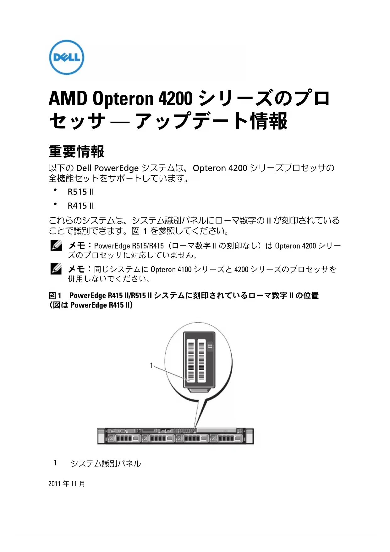 は Advanced Micro Devices, Inc. の登録商標です。AMD Opteron™ は Advanced Micro Devices の商標です。 商標または製品の権利を主張する事業体を表すためにその他の商標および社名が使用されて いることがあります。それらの商標や会社名は、一切 Dell Inc. に帰属するものではあり ません。AMD Opteron 4200 시리즈 프로세서 — 정보 업데이트