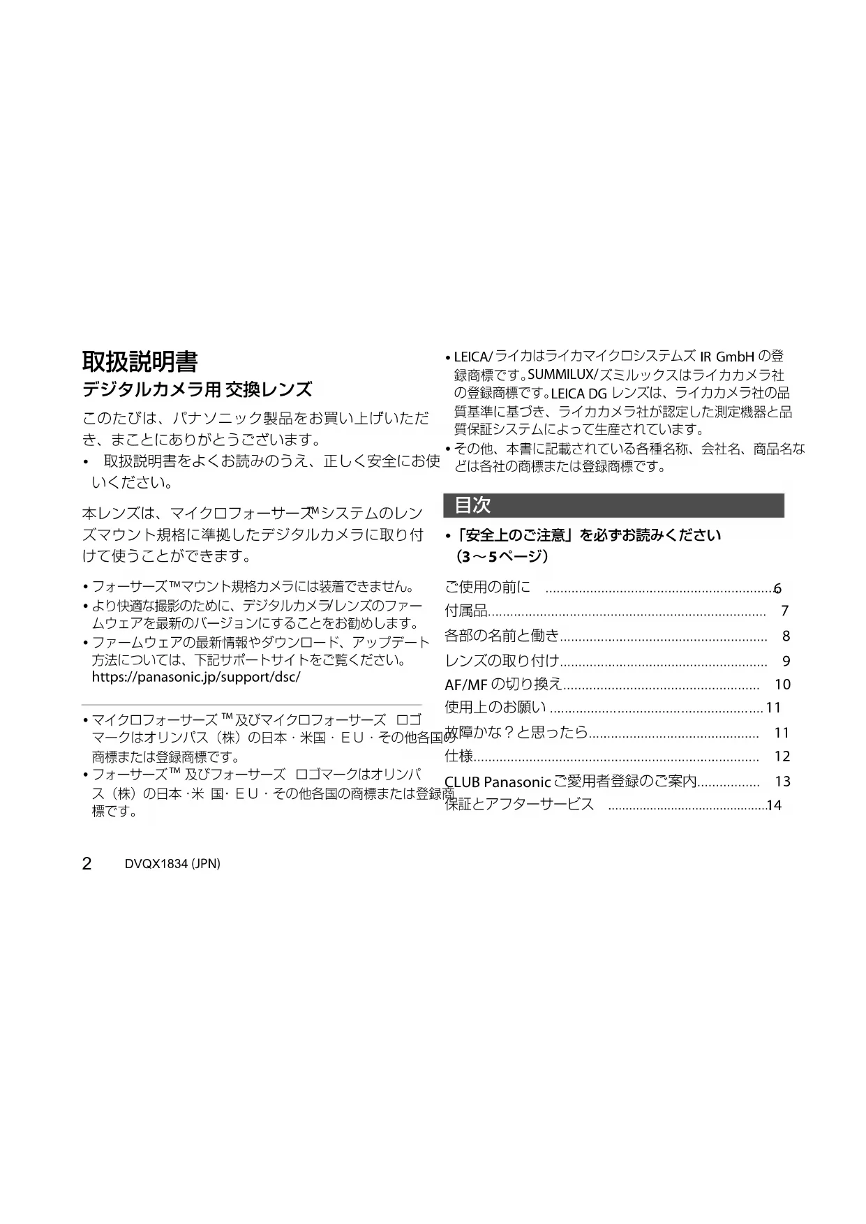SUMMILUX/ ズミルックスはライカカメラ社の登録商標です。 LEICA DG レンズは、ライカカメラ社の品質基準に基づき、ライカカメラ社が認定した測定機器と品質保証システムによって生産されています。 その他、本書に記載されている各種名称、会社名、商品名などは各社の商標または登録商標です。 0「安全上のご注意」を必ずお読みください