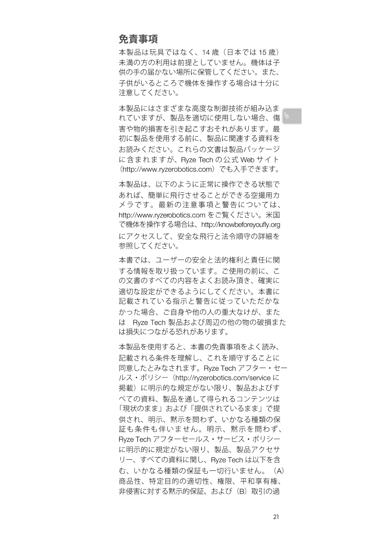 本書では、ユーザーの安全と法的権利と責任に関 する情報を取り扱っています。ご使用の前に、こ の文書のすべての内容をよくお読み頂き、確実に 適切な設定ができるようにしてください。本書に 記載されている指示と警告に従っていただかな かった場合、ご自身や他の人の重大なけが、また は Ryze Tech 製品および周辺の他の物の破損また は損失につながる恐れがあります。 本製品を使用すると、本書の免責事項をよく読み、 記載される条件を理解し、これを順守することに 同意したとみなされます。Ryze Tech アフター・セー ルス・ポリシー(http://ryzerobotics.com/service に 掲載)に明示的な規定がない限り、製品およびす べての資料、製品を通して得られるコンテンツは 「現状のまま」および「提供されているまま」で提 供され、明示、黙示を問わず、いかなる種類の保 証も条件も伴いません。明示、黙示を問わず、 Ryze Tech アフターセールス・サービス・ポリシー に明示的に規定がない限り、製品、製品アクセサ リー、すべての資料に関し、Ryze Tech は以下を含 む、いかなる種類の保証も一切行いません。(A) 商品性、特定目的の適切性、権限、平和享有権、 非侵害に対する黙示的保証、および(B)取引の過22