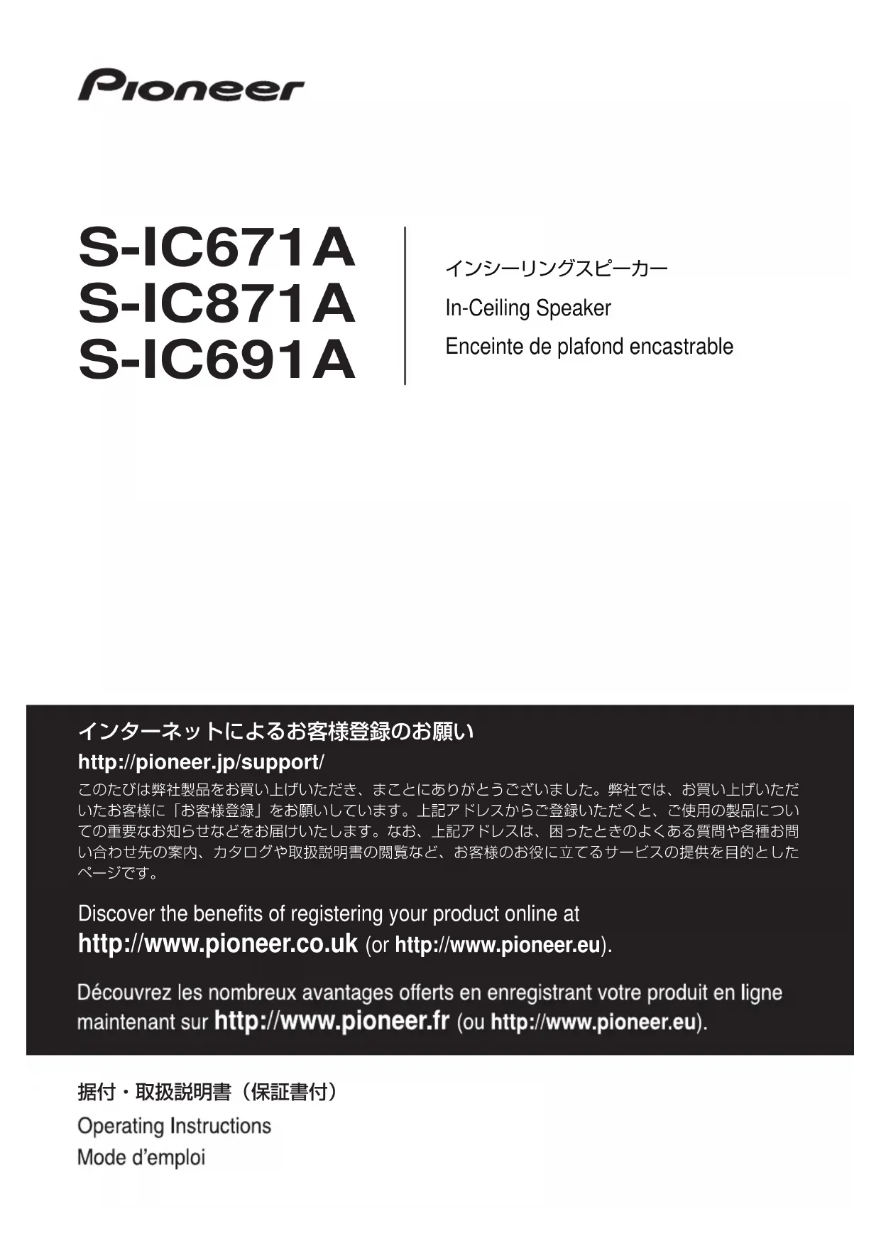 インシーリングスピーカー In-Ceiling Speaker Enceinte de plafond encastrable Discover the benefits of registering your product online at http://www.pioneer.co.uk (or http://www.pioneer.eu). S-IC671A S-IC871A S-IC691A 据付・取扱説明書(保証書付) http://pioneer.jp/support/ このたびは弊社製品をお買い上げいただき、まことにありがとうございました。弊社では、お買い上げいただいたお客様に「お客様登録」をお願いしています。上記アドレスからご登録いただくと、ご使用の製品についての重要なお知らせなどをお届けいたします。なお、上記アドレスは、困ったときのよくある質問や各種お問い合わせ先の案内、カタログや取扱説明書の閲覧など、お客様のお役に立てるサービスの提供を目的としたページです。 インターネットによるお客様登録のお願い cover_front.fm 1 ページ 2009年11月9日 月曜日 午後1時54分2
